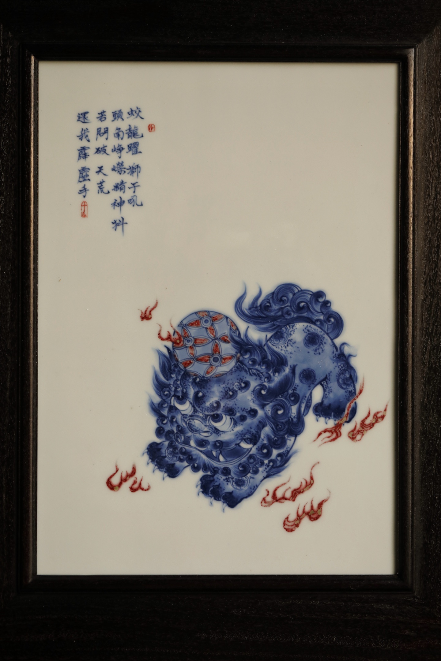 赞比亚紫檀×瓷板画“狮”来运转」挂屏赞比亚紫檀边框制作,内屏芯镶嵌瑞狮戏球青花釉里红瓷板画,整体清新脱。“时”来运转之意。53*42.5*2.8cm