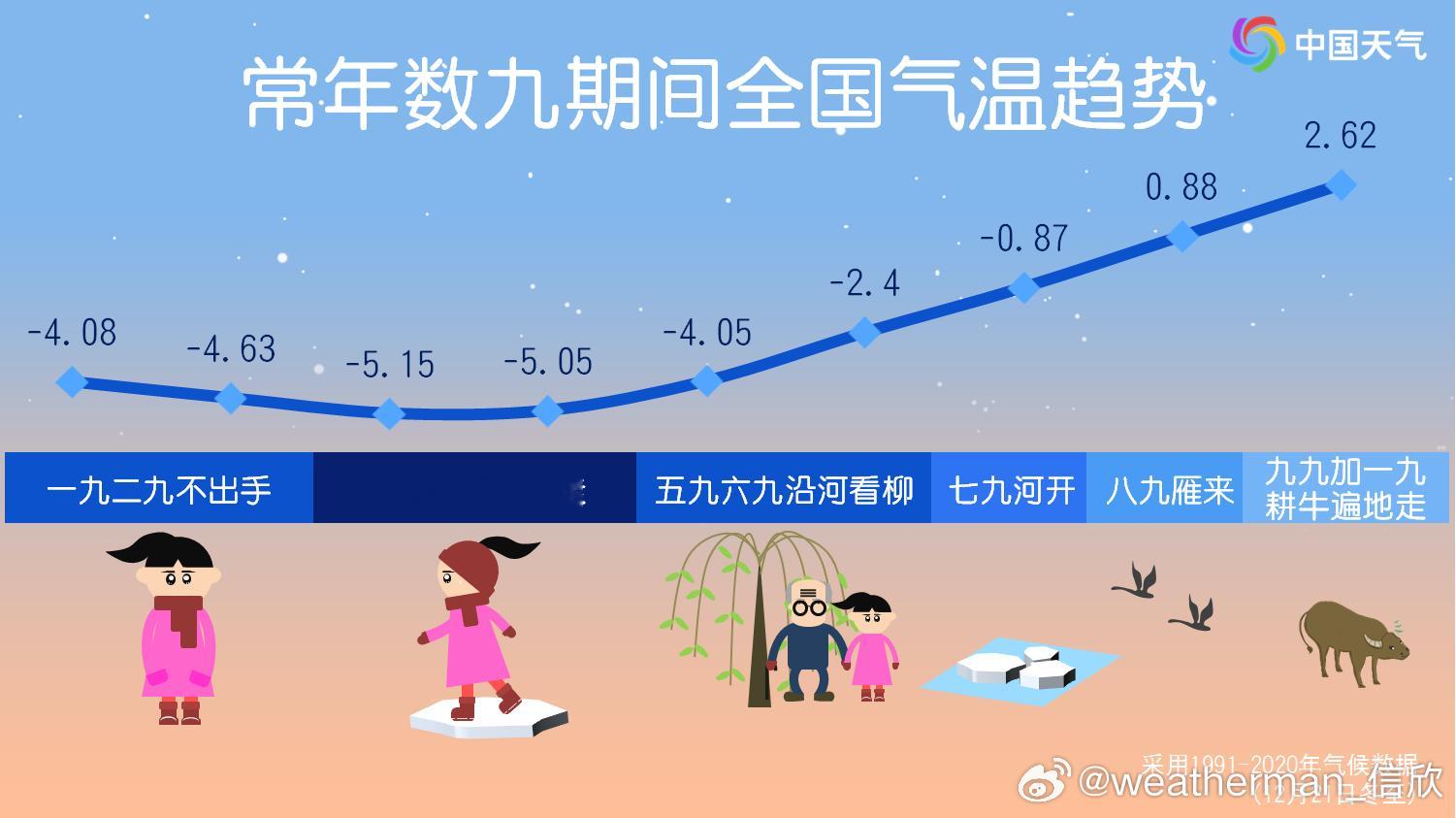 【气温】明天进入冬至数九的三九。通常三九为一年中平均最冷。未来几天,从最低气温看,0℃线还会留守南方,早晨天气确实冷。但从最高气温看,震荡回升,很多地方气温会明显高于常年同期。所以这个三九,昼夜温差大,总体越往后越暖。武汉长沙南昌报出13-14日最高可能要冲上20℃。