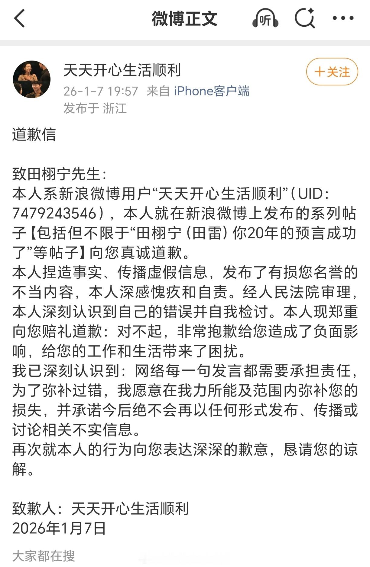 田栩宁胜诉伪装嫂子,造谣诽谤田栩宁的【男的】天天开心,向田栩宁道歉了。他还是团体作案,昨天开庭的。造谣一句话,辟谣跑断腿。