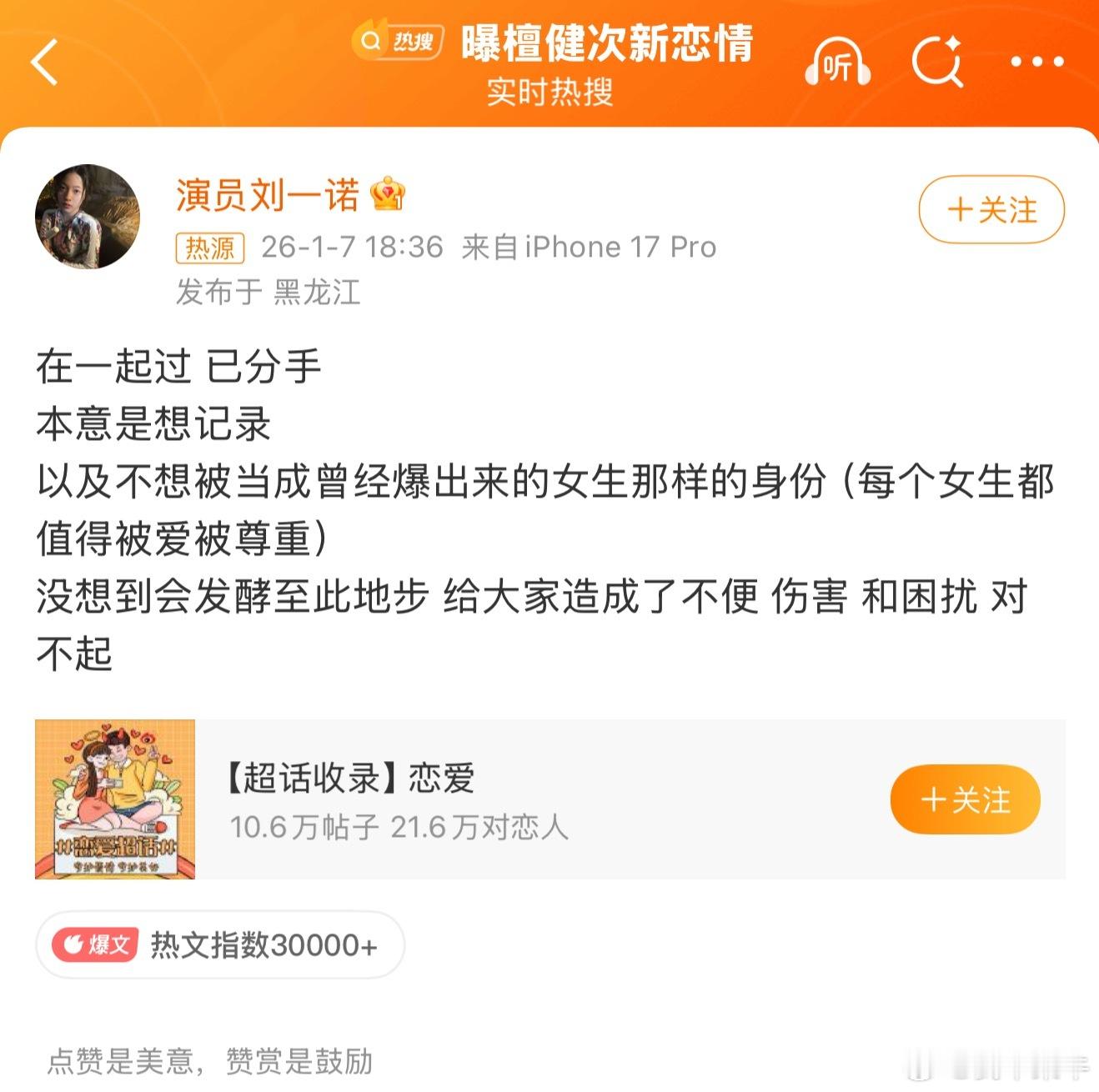 檀健次刘一诺 已分手这次画风有点突变啊……他哪里有时间去认识这女的。这几年每天都暴露在聚光灯下面。如果说是前几年,这女的成年没