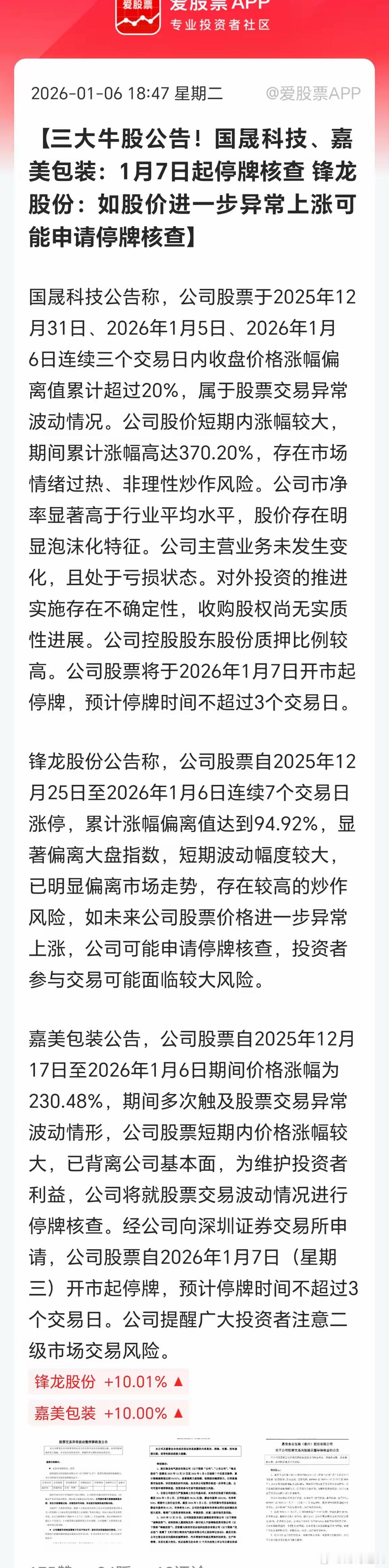 今晚国晟科技、嘉美包装双双停牌核查,锋龙股份警告再异动上涨就申请停牌!还有一堆商业航天、脑机的公司出降温的公告:1、3天2板航天电子:存在市场情绪过热及非理性炒作的情形;2、2连板航天长峰:目前公司未实际开展脑机接口等相关业务、不从事商业航天相关业务;3、3连板中国卫通:股价已严重脱离基本面 公司股票击鼓传花效应十分明显;4、中国卫星:股价短期涨幅过大 存在市场情绪过热风险;5、航天环宇:预计2025年公司商业航天相关收入占比不足15%;6、20CM两连板三博脑科:公司目前不涉及脑机接口产品的研发、生产及销售。7、20CM两连板伟思医疗:在脑机接口领域的新产品仍处于市场培育初期。开年这2天有点去年924的味儿了,监管要刹刹车!毕竟我们大A要走慢牛的,不能跑这么快。