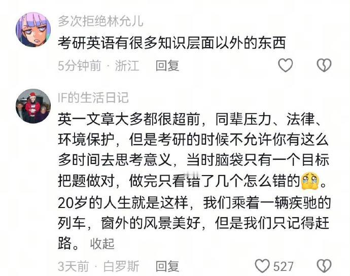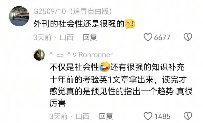 秋离 1 2026-01-08 09:18 四六级的文章一样很好,而且大二备考六级刷的某一套题的阅读理解成了我考研复试的英译中题目,讲二氧化碳排放与温室效应的,当时拿到题目扫了一眼直接读一句现场翻译一句,搞得老板以为我英语非常好,其实和其他同学差不多