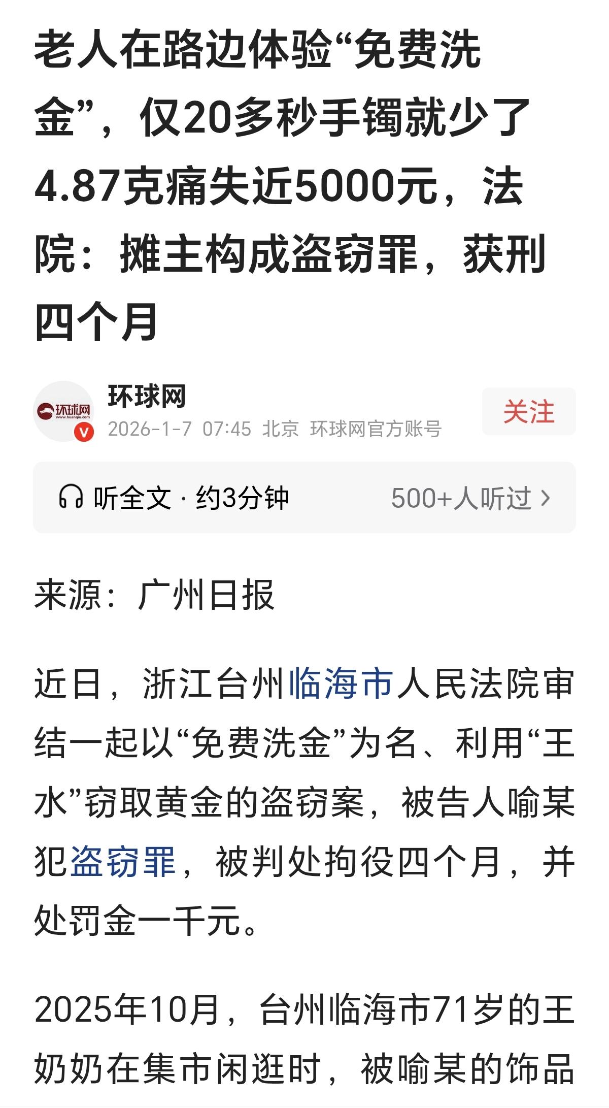 “贪小便宜吃大亏!”71岁的王奶奶在一个“免费洗金”的路边摊洗她的金手镯,结果20秒,损失近5000块。 据报道,去年秋天,浙江台州临海,71岁的王奶奶在逛街的时候被一个“免费洗金”的路边摊吸引住了。 摊主主动就说,可以为她免费洗手镯。 二三十秒过后,老人的手镯少了4.87克。 将近5000块,这么快就没了? 王奶奶不甘心,折返回去和摊主发生了争执并报警了。 免费的东西往往是很昂贵的。 如果王奶奶不想占个小便宜,也不会那么容易就放心把自己的金手镯交给一个路边摊主。 “免费”的噱头不知道被用过了多少次,有多少爱占小便宜的人上当受骗了,而有时候是那么防不胜防。 路边摊主同样也是因为贪婪而吃了大亏。 如果他能少洗掉一点,或许王奶奶也不会发现手镯的异样,他也就不会获刑4个月了。 贪婪,爱占小便宜,说起来关乎道德,但如果渐行渐远,就可能触碰法律的底线,到那时候就不是仅仅是受到良心的谴责,而确实要付出更大的代价了。 这也提醒我们,“勿以恶小而为之,勿以善小而不为”。
