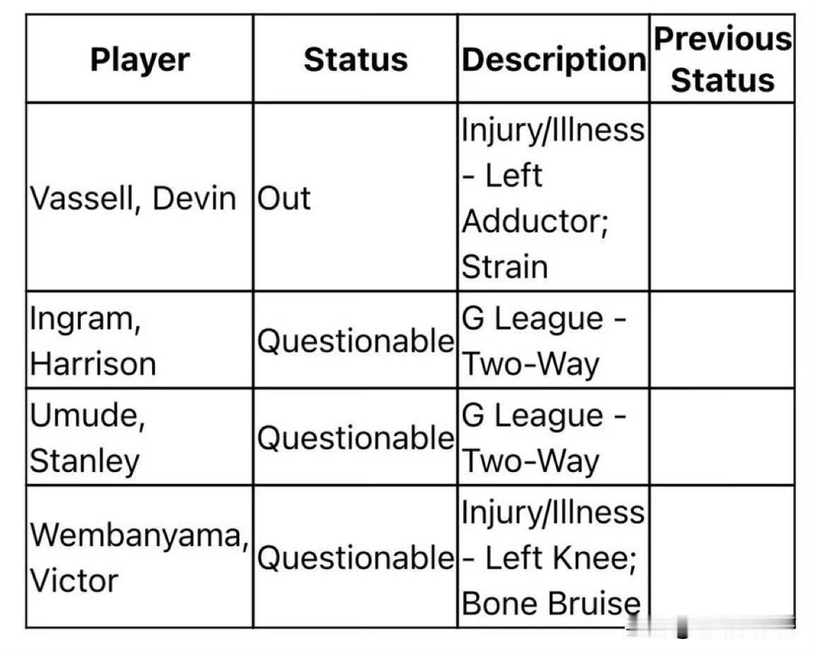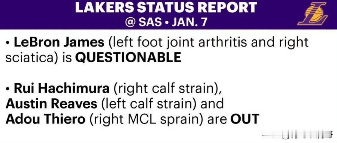 湖人vs马刺比赛预告!!!湖人对阵马刺比赛预测,湖人被看衰! 北京时间1月8号上午十点半,湖人做客圣安东尼奥挑战马刺队,这也是他们的背靠背客场比赛,湖人和马刺是西部的前三球队,这场比赛看点十足。 湖人伤病情况: 詹姆斯出战成疑,八村、里夫斯、蒂耶罗继续缺阵,不过今天八村会被下放到发展联盟参加训练。 马刺伤病情况: 瓦塞尔确定不打,文班亚马出战成疑。 目前,从ESPN给出的预测结果来看,湖人仅有不足四成的胜率被看衰,马刺则是非常被看好,双方球星都有出战成疑的情况,不过马刺显然实力更均衡一些。 马刺主场给出了-7.5,这么看差距还是不小的,马刺西部第二,湖人西部第三,今天也是一场非常关键的比赛,如果湖人能赢那么他们将反超马刺升至西部第二。 湖人 马刺 nba 湖人 詹姆斯