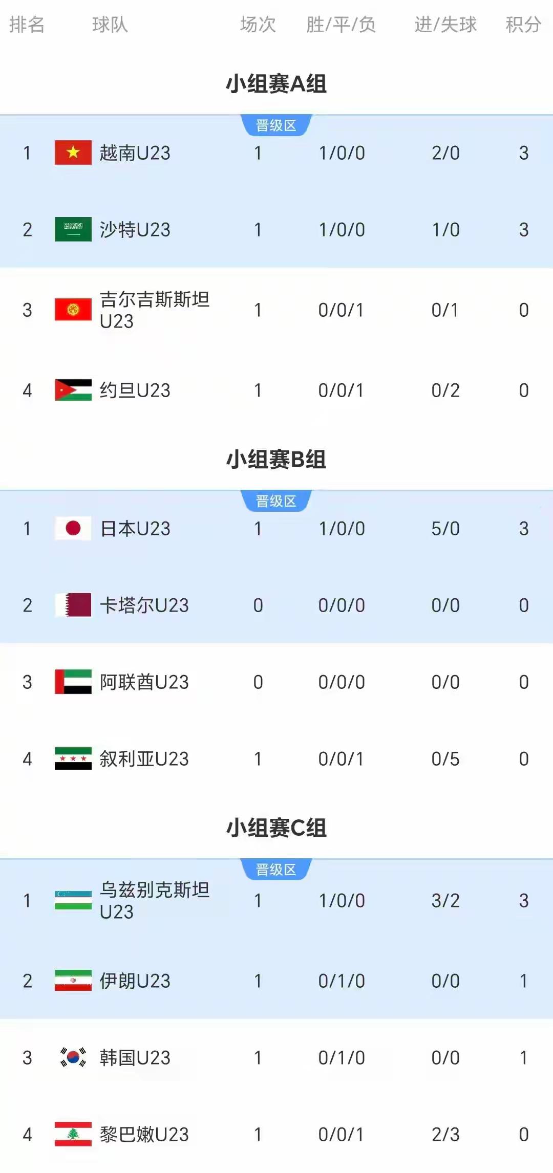 乌兹别克斯坦U23队3比2险胜黎巴嫩U23队,卡塔尔U23队0比2不敌阿联酋U23队,乌兹别克斯坦队依然强劲,上半场就连进3球,3比0领先阿联酋,想不到下半场风云突变,黎巴嫩连追2球,差点上演惊天大逆转,乌兹别克斯坦惊险守住胜利。 阿联酋足球进步明显,卡塔尔足球下滑严重,阿联酋U23轻轻松松2比0拿下卡塔尔,赢得开门红!卡塔尔输球出线已经岌岌可危!