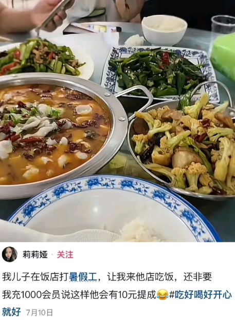 我儿子在饭店打暑假工,让我来他店吃饭,还非要我充1000会员说这样他会有10元提成