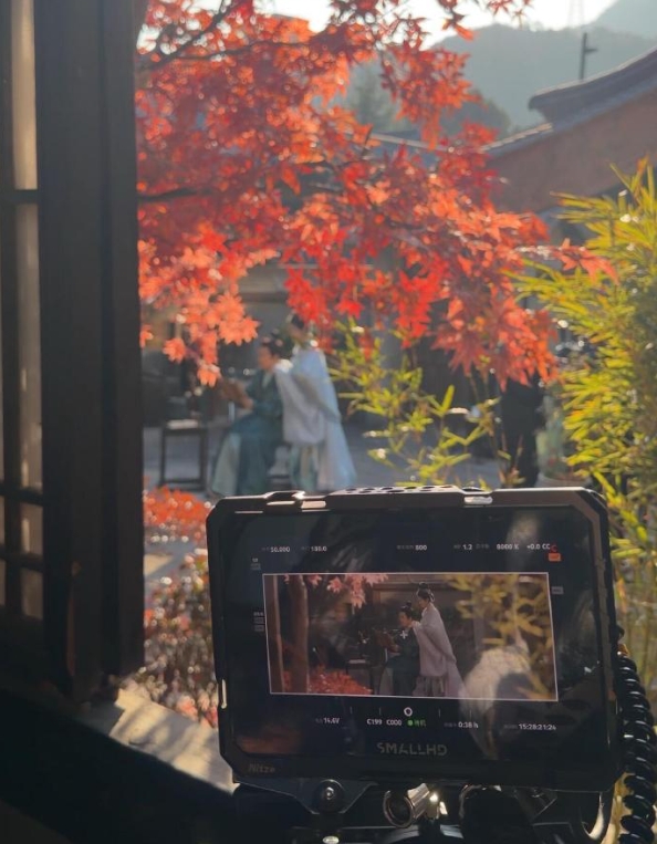 剧照中,于正给张慧雯簪发,尽显恩爱的状态,而从路透也能看出,两人的亲密对手戏也有不少。