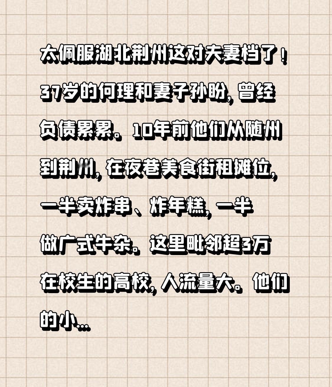 太佩服湖北荆州这对夫妻档了!37岁的何理和妻子孙盼,曾经负债累累。10年前他们从随州到荆州,在夜巷美食街租摊位,一半卖炸串、炸年糕,一半做广式牛杂。这里毗邻超3万在校生的高校,人流量大。他们的小吃物美价廉,生意火爆。现在何理每晚能卖1000多根淀粉肠、500多块炸年糕,妻子能卖1000多份广式牛杂,年进账超百万。他们炸淀粉肠手指都起茧子了,这成功背后是满满的汗水。夫妻俩还打算每年存下50万,这就是努力生活的意义啊!
