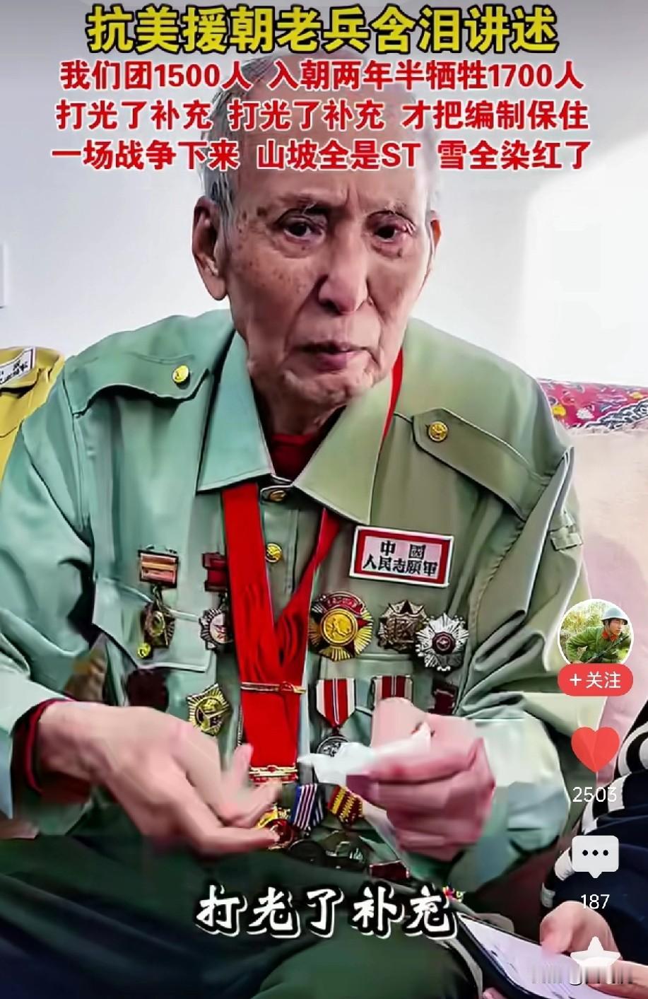 这位抗美援朝老兵 他说他所在的421团 共牺牲1700多人 而一个团只有1500人 是因为牺牲了又不断的补充。 致敬为国捐躯的志愿军们 反对战争,珍爱和平。