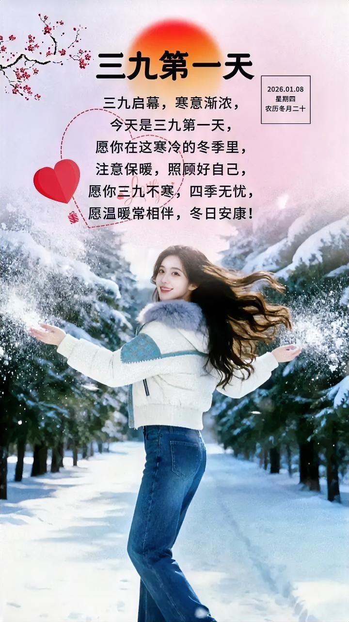 有牵挂,天涯不远, 有祝福,三九不寒, 有问候,心里温暖, 有快乐,健康永远! 今日三九第一天,数九寒天, 是一年中最冷的时候! 愿这个冬天温暖常伴,万事不寒 愿2026一切顺利, 我们都平安健康,幸福快乐,生活一天胜一天。 冬三九天 三九天气冷 三九时间 冬三九 三九习俗禁忌 极寒三九天 三九冷不冷 三九风俗 三九寒天 三九节祝福语