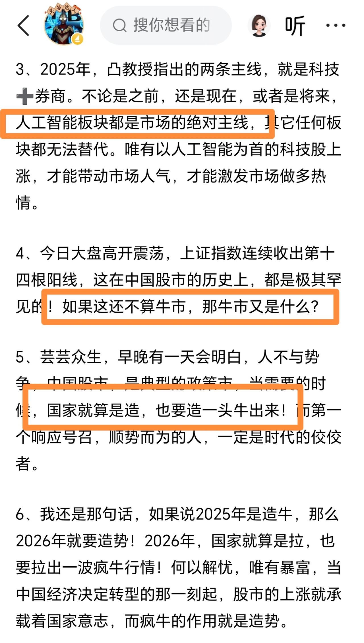 依然看多!凸教授深夜发文,不要被14连阳吓住了,股市还会继续上涨,2026年会是一个大牛市,一个以人工智能大科技为主线的牛市,这个是科技发展趋势,也是国内政策提倡的方向。凸教授表示很遗憾,很多投资者看不明白股市趋势,畏手畏脚,导致错失去年以来的机会!
