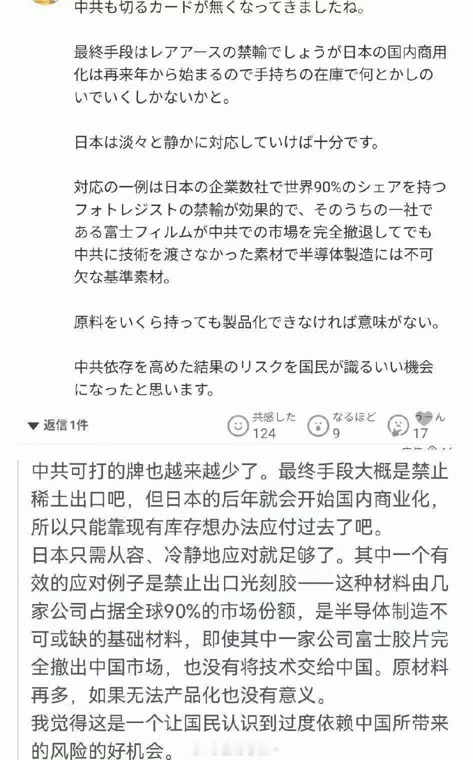 对于中国的出口管制,日本网友的评论大概有以下几种声音: 一,觉得中国的管制,刚好可以让日本和中国脱钩。希望日本早日和中国脱钩,打击中国经济。 二,希望高市早苗政府能够禁止中国人入境,把中国人全部驱赶出去。 三,寄希望于美国,希望美国可以狠狠打压中国,最好像委内瑞拉一样。 四,骂亲华的日本政客,尤其是前几任亲华的日本首相。 五,支持高市早苗反制中国,停止光刻胶和半导体设备出口。