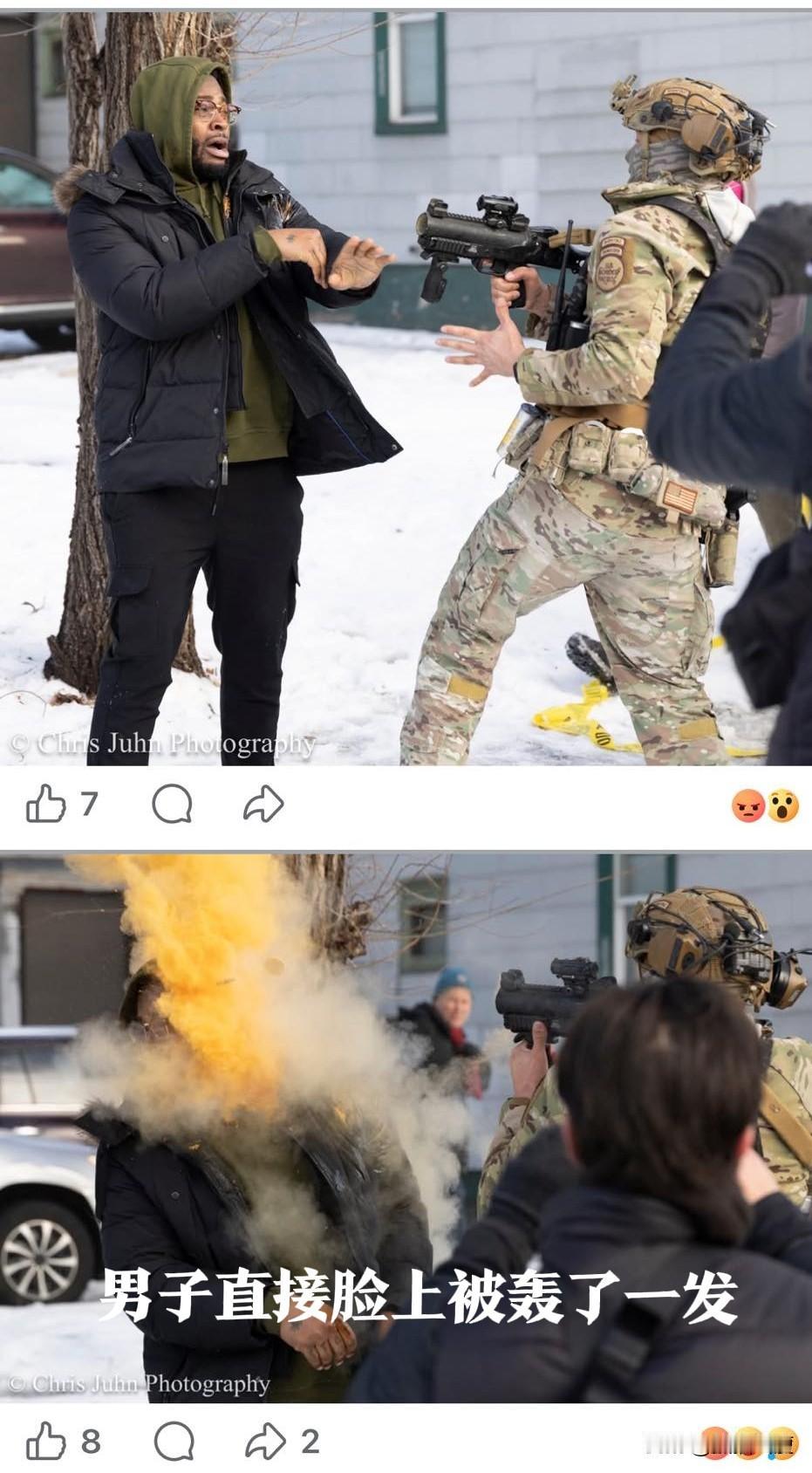 美国这是要内战了吧?只是不分南北而分祖籍地: 昨日在美国明尼阿波利斯,一名37岁女性开车时试图离开街区,美国移民管理局(ICE)探员,遭到对方拦截,一名探员对着方向盘后的女子脸上就是三发,留下她不知所措当时还在帮忙录像的妻子,她们还有一名6岁的女儿……而一名医生见状,尝试冲向车辆救治,被一群探员阻拦。 这一切来自于ICE在全美对【祖籍】不是美国的疯狂追捕。 而同样在该市,同样的时间点,不少试图阻止ICE探员搜查的美国居民,同样尝到了【最甜美】的滋味……
