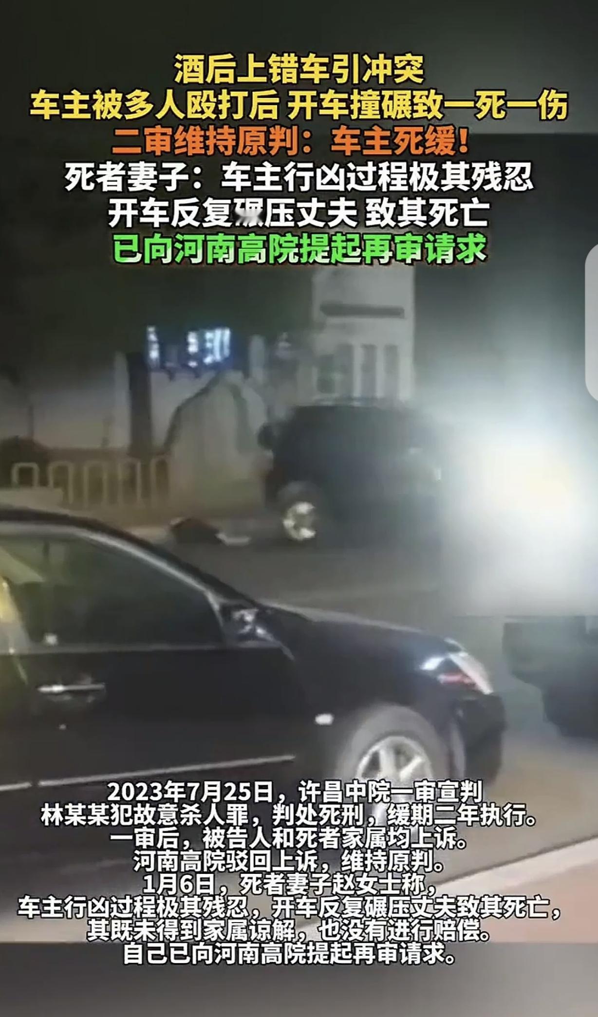 河南许昌,一男子开着路虎吃完火锅,在车上等代驾司机,突然,4个醉汉坐上他的车,让男子开车把他们送回家,男子拒绝,被4个男子围殴,男子挣脱后,开着路虎逃跑,但他咽不下这口气,竟然又开车返还,直接撞向4人,导致一死一伤,法院判决男子死缓,死者家属不服,一起上诉,二审竟然维持原判,死者家属继续不服,又提请再审。家属哭诉:男子极其残忍,开车反复碾压我丈夫致死,既没有得到家属谅解,也没进行赔偿,凭啥判死缓? 据1月7日潇湘晨报报道,2022年10月28日,晚上6点多,林某某开着路虎去火锅店吃火锅。 9点多,林某某吃的沟满壕平走出火锅店,因为喝酒不开车,所以他叫了代驾,但司机还没来,他就坐在车上等。 突然,车门被打开,4个醉汉坐上了林某某的车,他们满嘴酒气,看来没少喝,吆五喝六的让林某某送他们回家。 林某某反应过来后,觉得4个人应该是上错车了,别说他们不认不识,就是认识,他也不能送呀,他也喝酒了,不能酒后开车,以身试法。 可万万没想到,他拒绝后,双方发生了争执,进而动起手。 对方4个人,林某某就自己,他被4人围住后拳打脚踢,他拼尽全力才挣脱出来,好汉不吃眼前亏,他赶紧开车逃之夭夭。 可林某某越想越生气,自己招谁惹谁了?出来吃个火锅,竟然被围殴,他咽不下这口气,再加上酒精的刺激,顿时失去理智。 随后,林某某又开车折返,他想,如果这几个人走了,这事自己自认倒霉,如果他们还在,那这笔账一定要算。 万万没想到,4个人竟然还没走,看到他们,林某某眼冒金星,气血上涌,他一脚油门,直接开车撞了上去。 有2个人反应挺快躲开了,而有个叫徐某某的,就不那么幸运了,他被撞倒后,林某某开车反复碾压,导致他当场身亡。而另外一叫朱某某的为轻伤二级。 悲剧就这么发生了,现场很是惨烈,徐某某4人上错车了,本应该下车离开,却仗着人多势众,对林某某大打出手,而林某某本来都开车离开了,愤怒让他失去理智,做出追悔莫及的事来,这代价太惨痛了。 退一步海阔天空,不要一时冲动,很多事都是冲动逞强造成悲剧。 最终,林某某因为故意杀人罪,被判处死刑,缓期2年执行。赔偿徐某某家属39451.5元,赔偿朱某某2345.88元,路虎车没收。 但徐某某妻子赵女士不依不饶,提起上诉,赵女士认为判决太轻,一审漏判死亡赔偿金、精神抚慰金、被抚养人生活费等,而且,也不知道林某某路虎车买了保险,也没一起起诉保险公司,二审直接保险公司也推上被告席。 同时,林某某家属也上诉了,认为判决太重,酒后,上错车,多人殴打,于是乎自卫,判的有点过了,应属于防卫过当!林某某有自首情节,而且属于激情犯罪,他们也愿意积极赔偿赵女士,希望二审改判。 可让双方都意外的是,二审竟然维持原判。 赵女士继续不服,准备再次提起再审。撞一下情有可原,反复碾压就是故意杀人了! 有人觉得,死者殴打他人是主因!没有四名醉汉殴打车主的恶行就没有后来的死亡,有期徒刑15年比较合适。 这案子不难判呀,怎没搞成这样?打人的按打人论处,杀人的按杀人论处,因为事出有因,那就改死缓,只要表现好,十几年还是要坐的。 这案子看得人憋屈又窝火,两边都犯了混,但后果太惨烈。 四个醉汉是真是不作不死,大晚上喝得五迷三道,二话不说就上人家车,还围殴车主,这就是典型的寻衅滋事加故意伤害。 没这出开头的恶行,后面啥事没有。他们必须为自己这顿打负主要责任! 林某某也魔怔了,被揍了谁都气,开车跑了是正常人该做的。但掉头回来撞人,尤其反复碾压,这性质就彻底变了!从“受害者”直接变身“故意杀人”,而且手段极其凶狠。 法律不可能容忍为报仇,当街开车撞人碾压致死这种极端行为,判死缓真不算冤枉他。 冲动是魔鬼,林某某但凡当时忍下这口气,直接报警验伤,四个醉汉肯定逃避不了责任。现在是“别人打你一顿,你剥夺他生命”,代价是把自个儿一辈子也搭进去了。 四个醉汉是始作俑者,林某某由“冤”变“狠”也把自己送进深渊。 《刑法》第232条规定:故意杀人的,处死刑、无期徒刑或者十年以上有期徒刑;情节较轻的,处三年以上十年以下有期徒刑。 林某某驾车折返后故意冲撞并反复碾压徐某某致死,监控及判决书证实,其行为并非防卫脱离现场后返回属蓄意报复,也远超防卫过当范畴。 法院认定醉汉主动挑衅、围殴林某某存在重大过错,且林某某有自首、激情犯罪情节,符合“不是必须立即执行死刑”的死缓适用条件。 反复碾压暴露林某某的残忍性,抵消部分从轻理由。若仅判有期徒刑,难以匹配杀人手段的恶劣程度。 法院判决的3.9万元属丧葬费等直接经济损失《刑事诉讼法》规定刑附民赔偿不含死亡赔偿金、精神抚慰金。 家属如果主张其他赔偿,需另行民事诉讼,但保险公司不赔故意犯罪所致损失,二审驳回其诉保险公司合理。 关注@灋律盐究员 学法辩是非,用法止纷争。