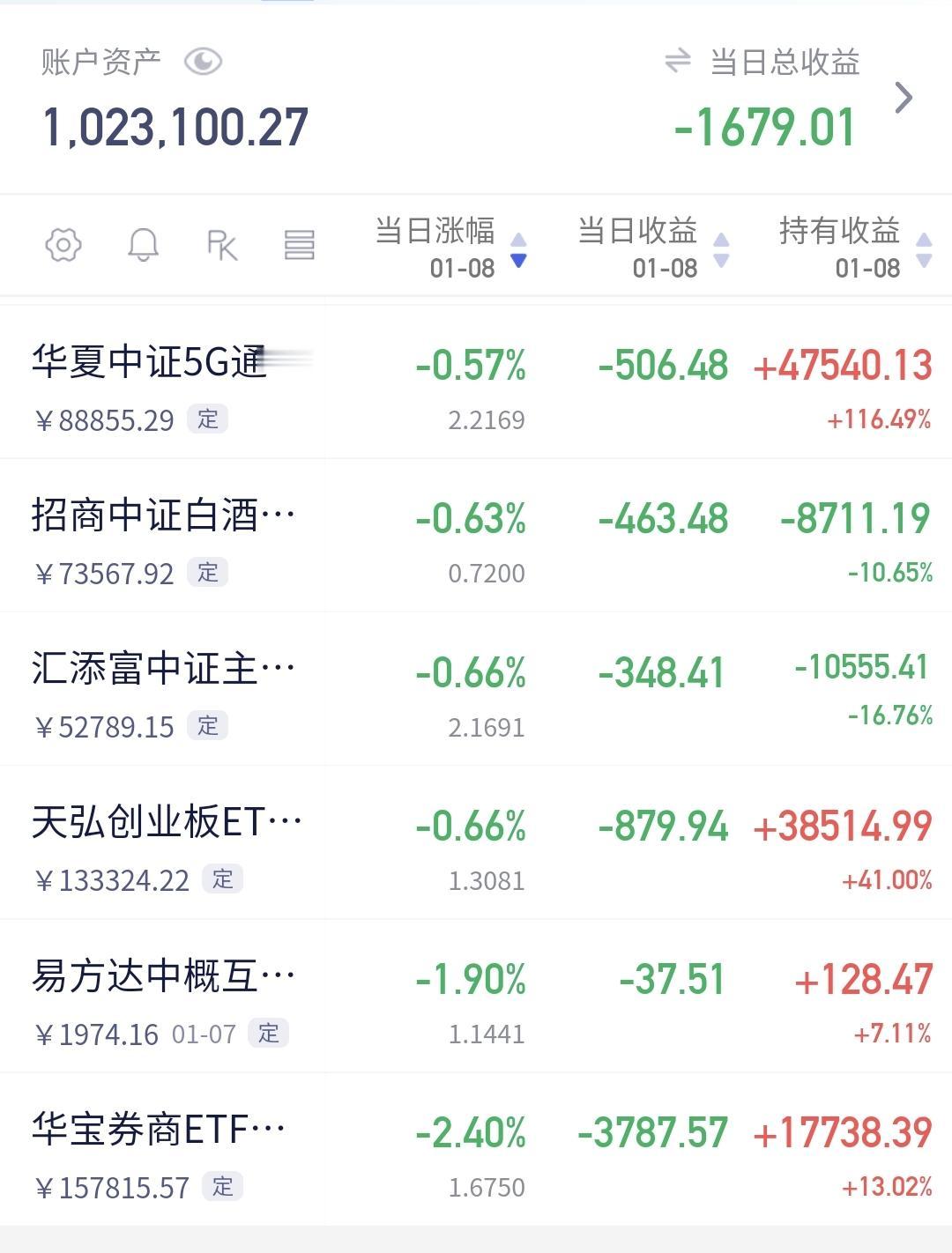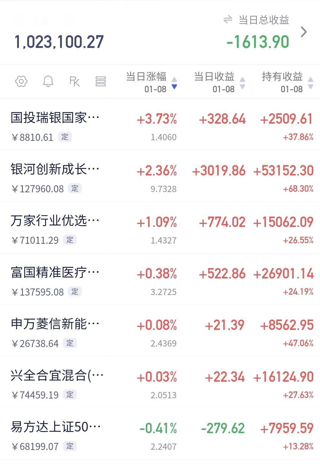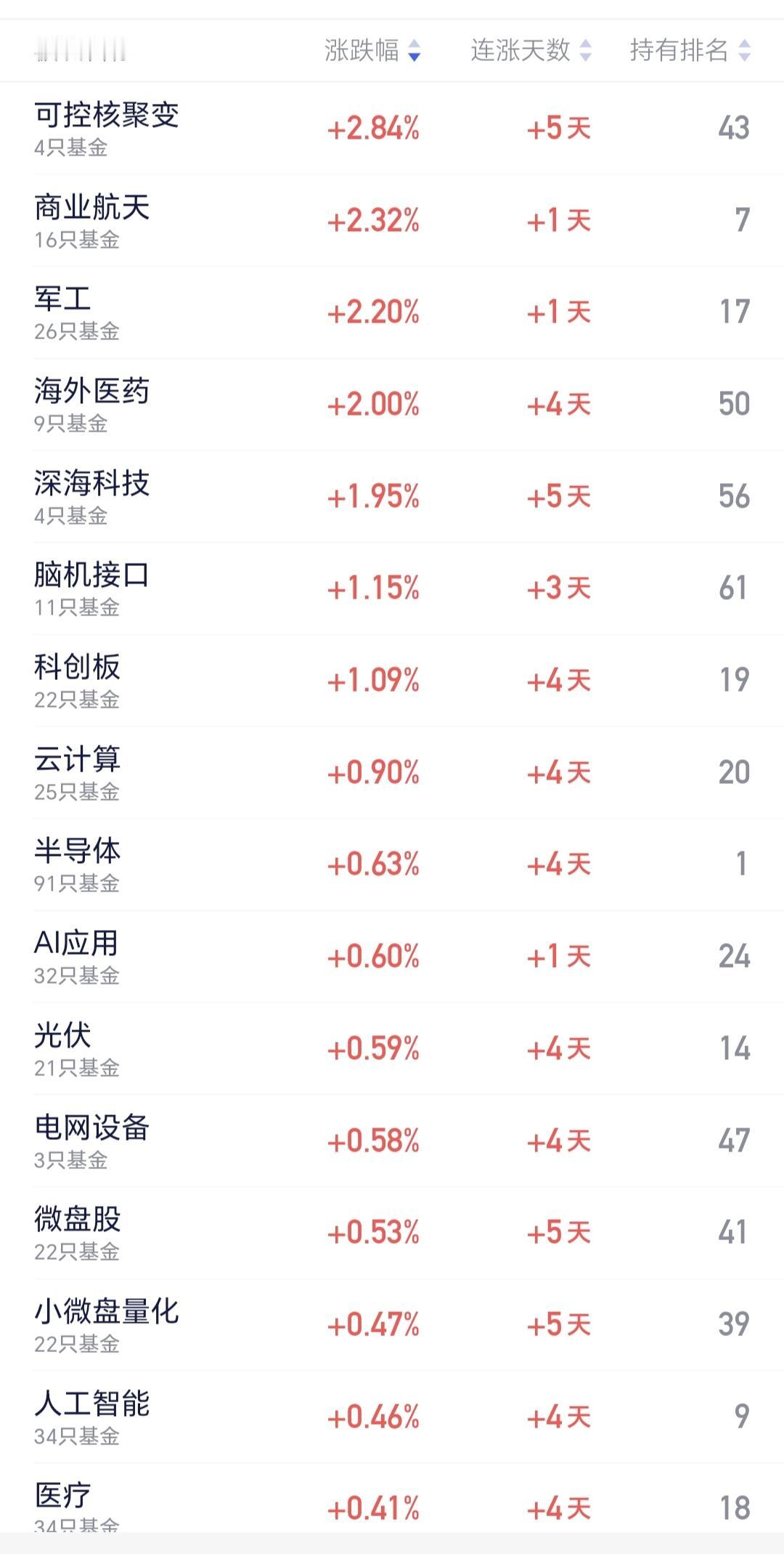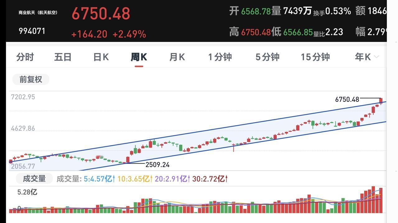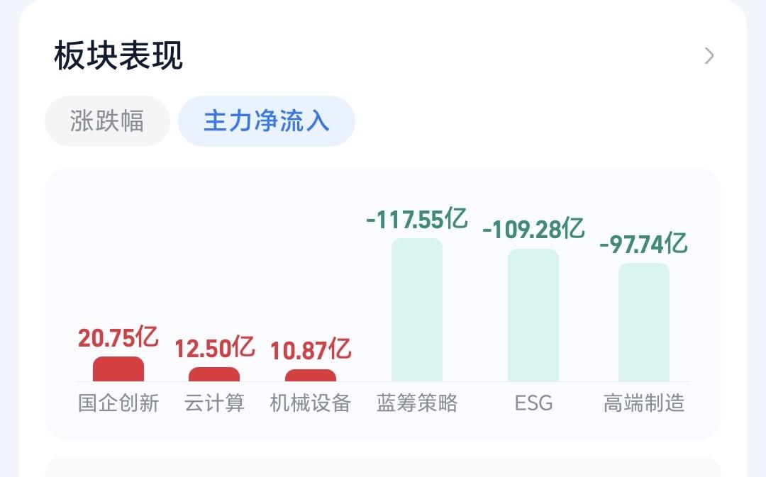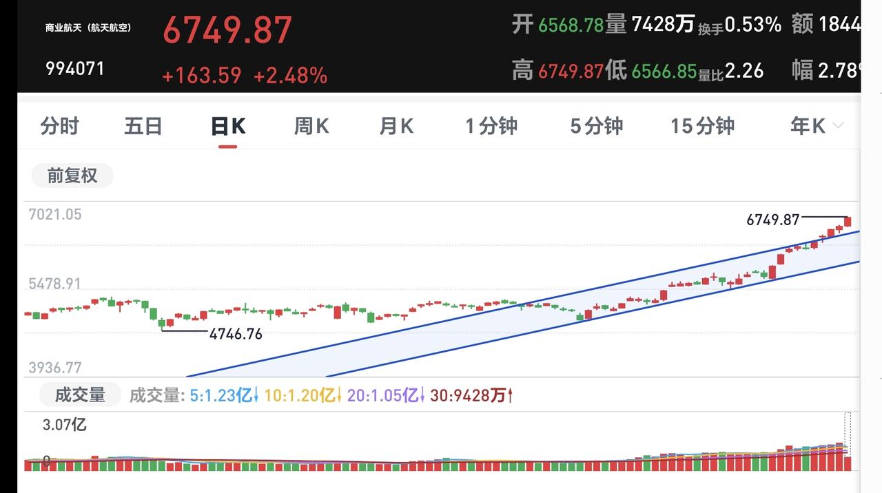 基金:市场指数再创新高的概率大不大 今天市场低开以后小幅度震荡,现在三大指数都是小跌,创业板指下跌了0.49%,盘中点位3313点,上证指数下跌了0.05%,盘中点位4083点。 现在黄色线还是在蓝色线上方,两条线之间的敞口还是比较大,这么大的敞口是不容易大跌的,即使跌下去,也很容易被拉回头。 现在两市累计成交12469亿,相比于昨天缩量了10%,上涨3405家,下跌1862家,涨停61家,跌停6家,这些数据都是比较正常。 今天板块中上涨幅度前三名的是:可控核聚变板块,商业航天板块,军工板块。 商业航天板块现在盘中估值上涨了2.40%,这个板块今天加仓排行榜下面的截图7,持有人数排行榜见下面的截图8,排名第一的都是永赢高端装备智选混合。 我们来看一下下面的截图9,这是商业航天板块日K线图,从图中可以看出,我画了两条倾斜向上的斜线,这是商业航天板块日线级别上涨通道,星期一的时候上涨突破了这个上涨通道的上轨,开启了加速上涨状态,持有的人可以继续持有。 我们来看一下下面的截图10,这是商业航天板块周k线图,从图中可以看出,我画了两条倾斜向上的斜线,这是商业航天板块周线级别上涨通道,本周的上涨突破了这个上涨通道的上轨,周线级别也有可能开启加速上涨状态。 我们来看一下下面的截图10,这是主力资金进出板块的情况,主力资金净流入最多的三个板块是:国企创新板块,云计算板块,机械设备板块,主力资金净流出最多的三个板块是:蓝筹策略板块,esg板块,高端制造板块。 持有的基金中,估值上涨幅度最大的三个板块是:军工板块,芯片半导体板块,先进制造板块,下跌幅度最大的三个板块是:证券板块,创业板指,大消费板块,估值整体亏损了1679元。 今天市场走势到现在为止都是很正常的,这样的小幅度震荡调整是良性的,这样的小幅度调整更有利于后面创新高,市场再创新高是大概率的,市场突破4100点是大概率的,震荡调整越充分,上冲的高度就会越高。 我每天都会分享我的观点,我的观点只代表我个人的看法,不能作为你操作的依据,据此操作后果自负。