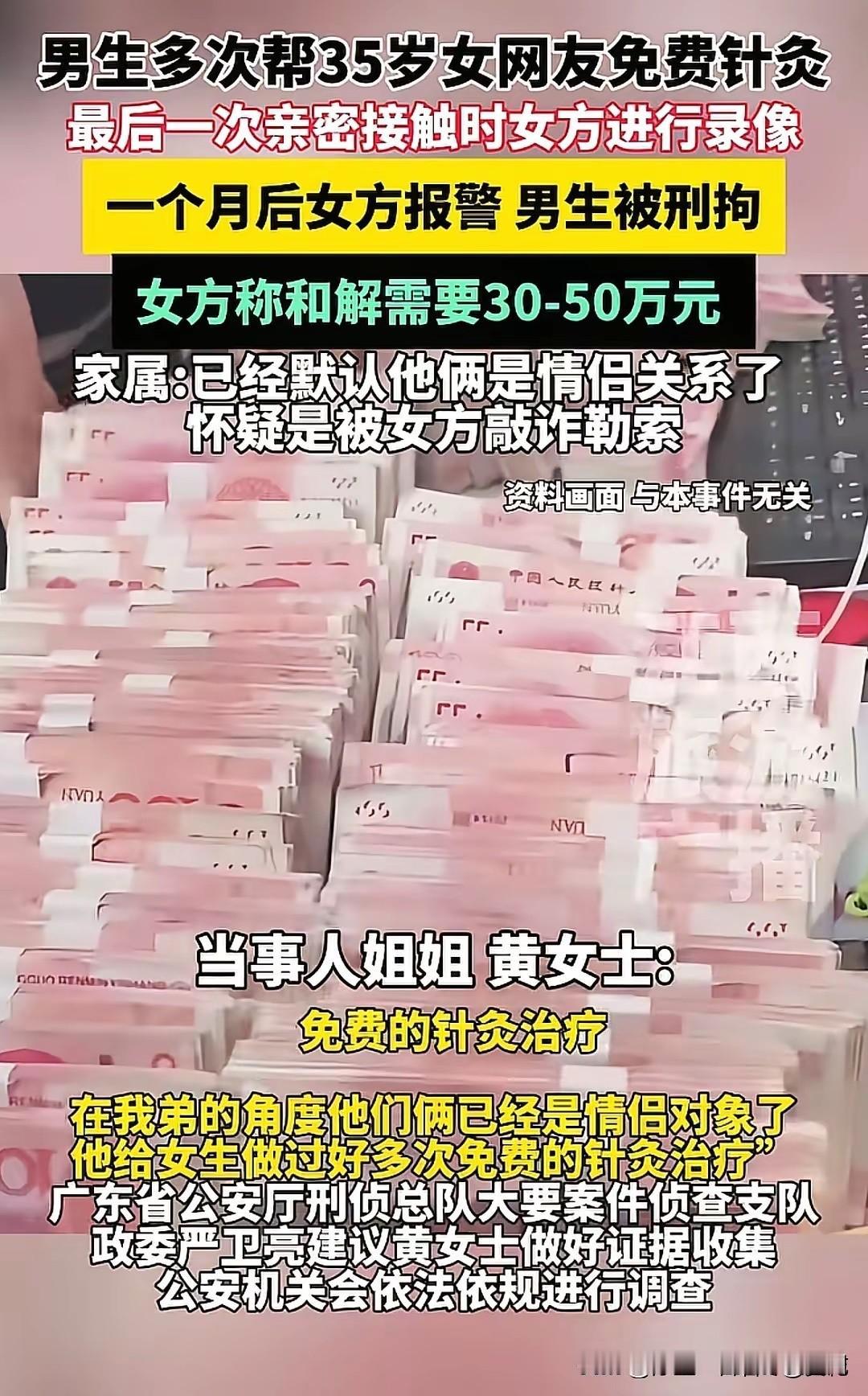 近期小编发现,在广州某男子多次帮35岁女子免费针灸。最后一次亲密接触是偷偷录像,一个月后女方报警,南方被刑拘。女方称:和解需要30-50万 针对此事,黄女士称:怀疑对方进行敲诈!针对此事,大家怎么看?化债误区