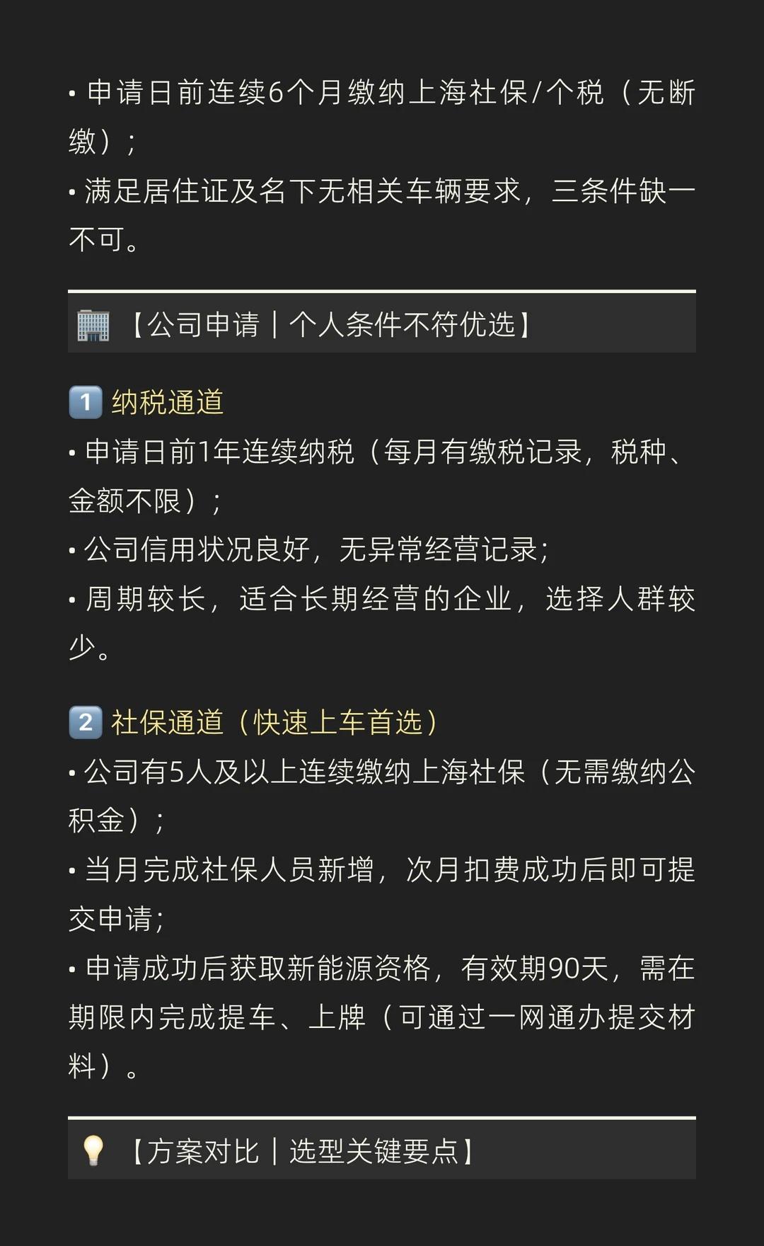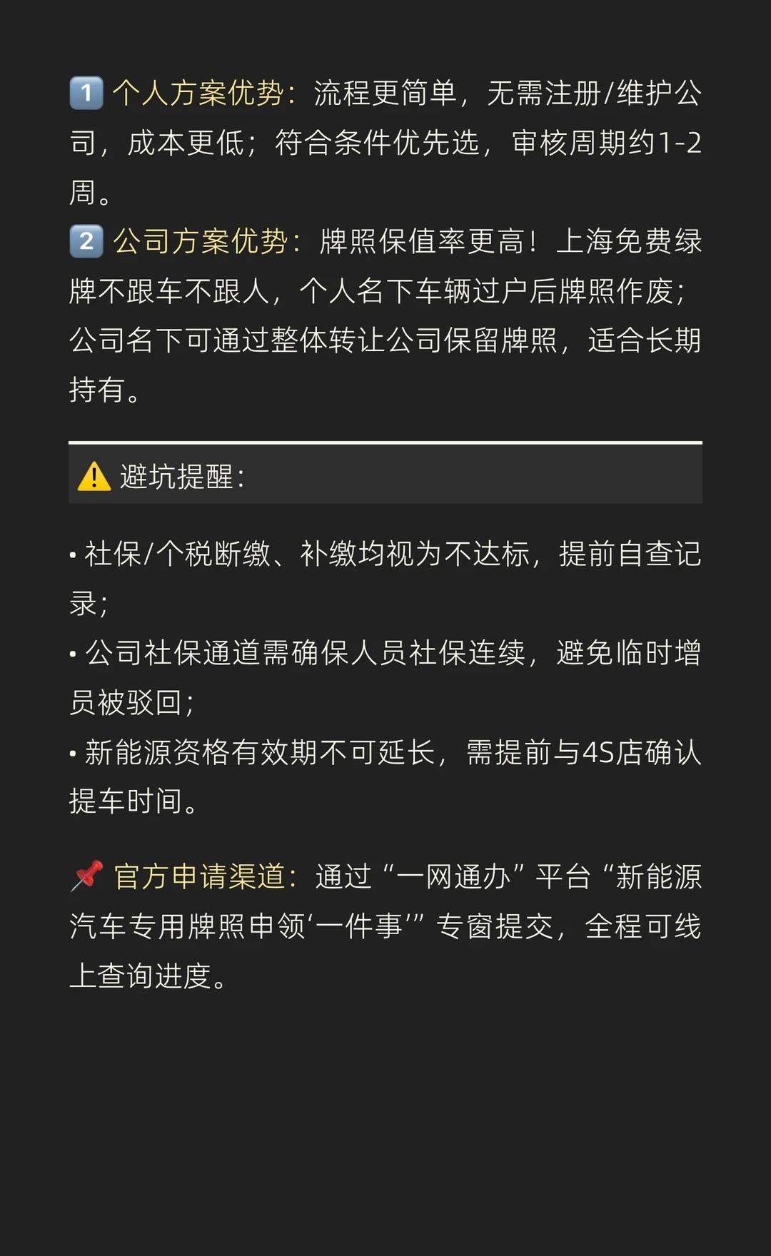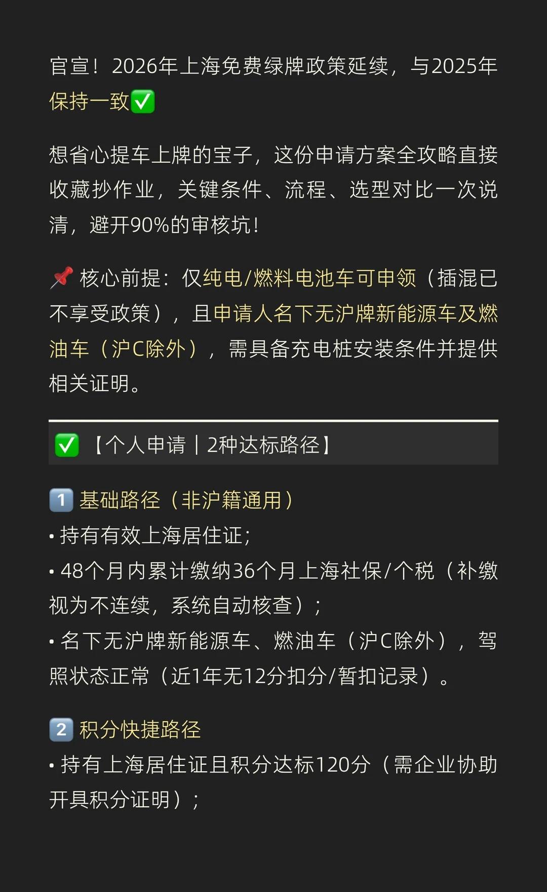 上海绿牌继续送!2026申请攻略🔥 官宣!2026年上海免费绿牌政策延续,与2025年保持一致✅ 想省心提车上牌的宝子,这份申请方案全攻略直接收藏抄作业,关键条件、流程、选型对比一次说清,避开90%的审核坑! 📌 核心前提:仅纯电/燃料电池车可申领(插混已不享受政策),且申请人名下无沪牌新能源车及燃油车(沪C除外),需具备充电桩安装条件并提供相关证明。 ✅ 【个人申请|2种达标路径】 1️⃣ 基础路径(非沪籍通用) • 持有有效上海居住证; • 48个月内累计缴纳36个月上海社保/个税(补缴视为不连续,系统自动核查); • 名下无沪牌新能源车、燃油车(沪C除外),驾照状态正常(近1年无12分扣分/暂扣记录)。 2️⃣ 积分快捷路径 • 持有上海居住证且积分达标120分(需企业协助开具积分证明); • 申请日前连续6个月缴纳上海社保/个税(无断缴); • 满足居住证及名下无相关车辆要求,三条件缺一不可。 🏢 【公司申请|个人条件不符优选】 1️⃣ 纳税通道 • 申请日前1年连续纳税(每月有缴税记录,税种、金额不限); • 公司信用状况良好,无异常经营记录; • 周期较长,适合长期经营的企业,选择人群较少。 2️⃣ 社保通道(快速上车首选) • 公司有5人及以上连续缴纳上海社保(无需缴纳公积金); • 当月完成社保人员新增,次月扣费成功后即可提交申请; • 申请成功后获取新能源资格,有效期90天,需在期限内完成提车、上牌(可通过一网通办提交材料)。 💡 【方案对比|选型关键要点】 1️⃣ 个人方案优势:流程更简单,无需注册/维护公司,成本更低;符合条件优先选,审核周期约1-2周。 2️⃣ 公司方案优势:牌照保值率更高!上海免费绿牌不跟车不跟人,个人名下车辆过户后牌照作废;公司名下可通过整体转让公司保留牌照,适合长期持有。 ⚠️ 避坑提醒: • 社保/个税断缴、补缴均视为不达标,提前自查记录; • 公司社保通道需确保人员社保连续,避免临时增员被驳回; • 新能源资格有效期不可延长,需提前与4S店确认提车时间。 📌 官方申请渠道:通过“一网通办”平台“新能源汽车专用牌照申领‘一件事’”专窗提交,全程可线上查询进度。 绿色新能源 新能源 车牌选号 汽车圈观察者 沪牌过户 上牌 沪牌额度摇号