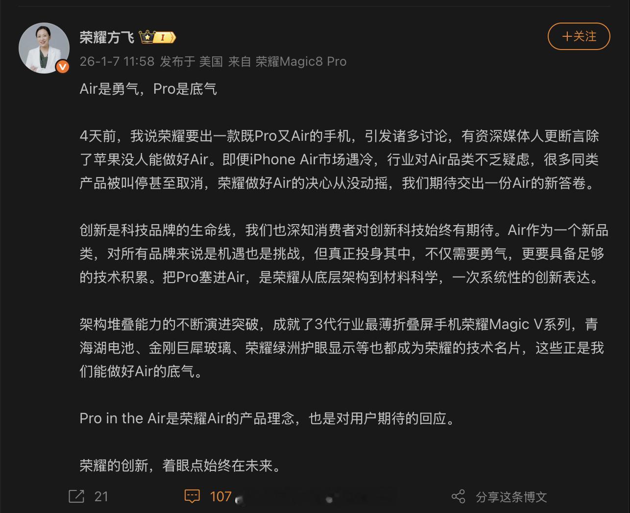 开年数码圈的Air手机之争越聊越热!早前荣耀高管方飞预告要做“既Pro又Air”