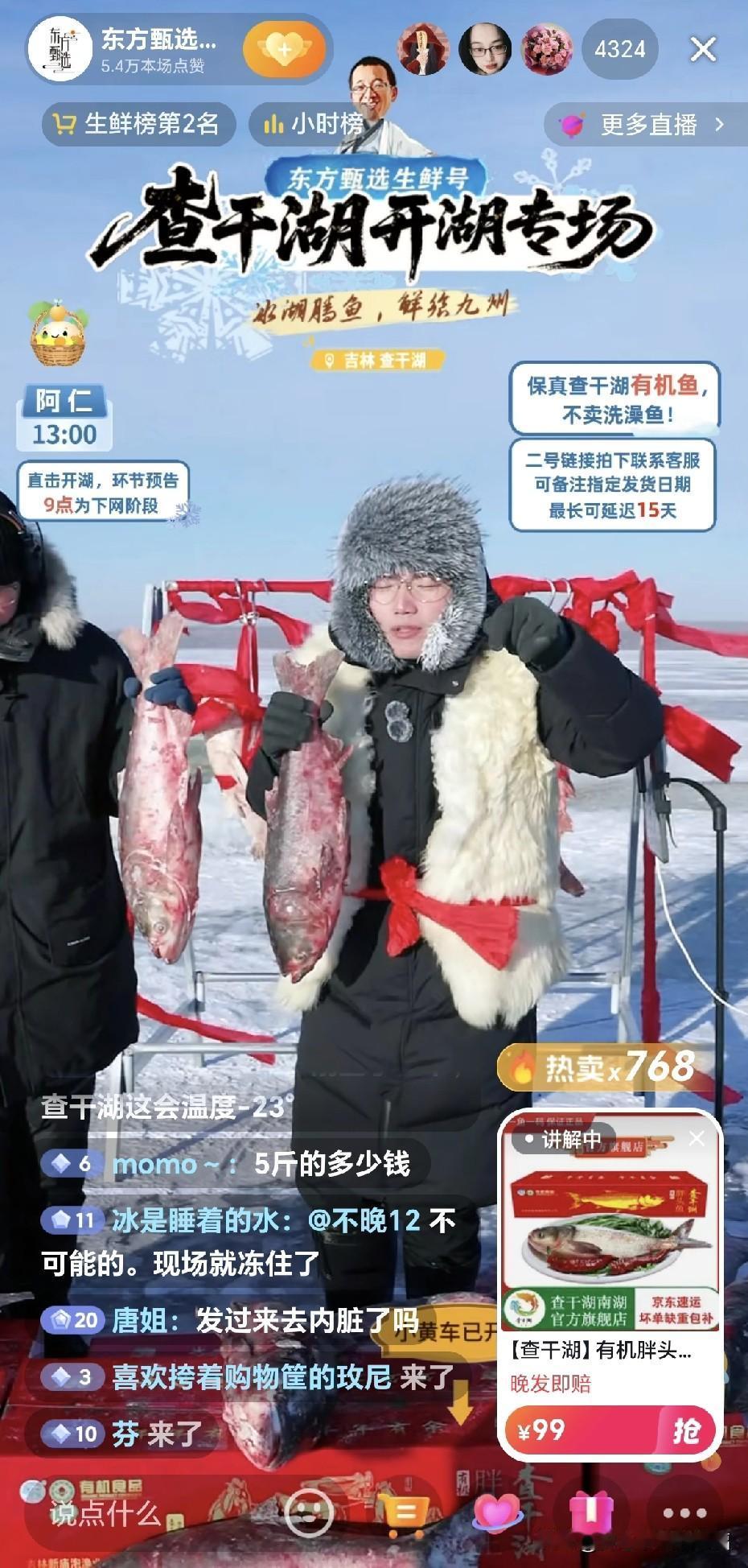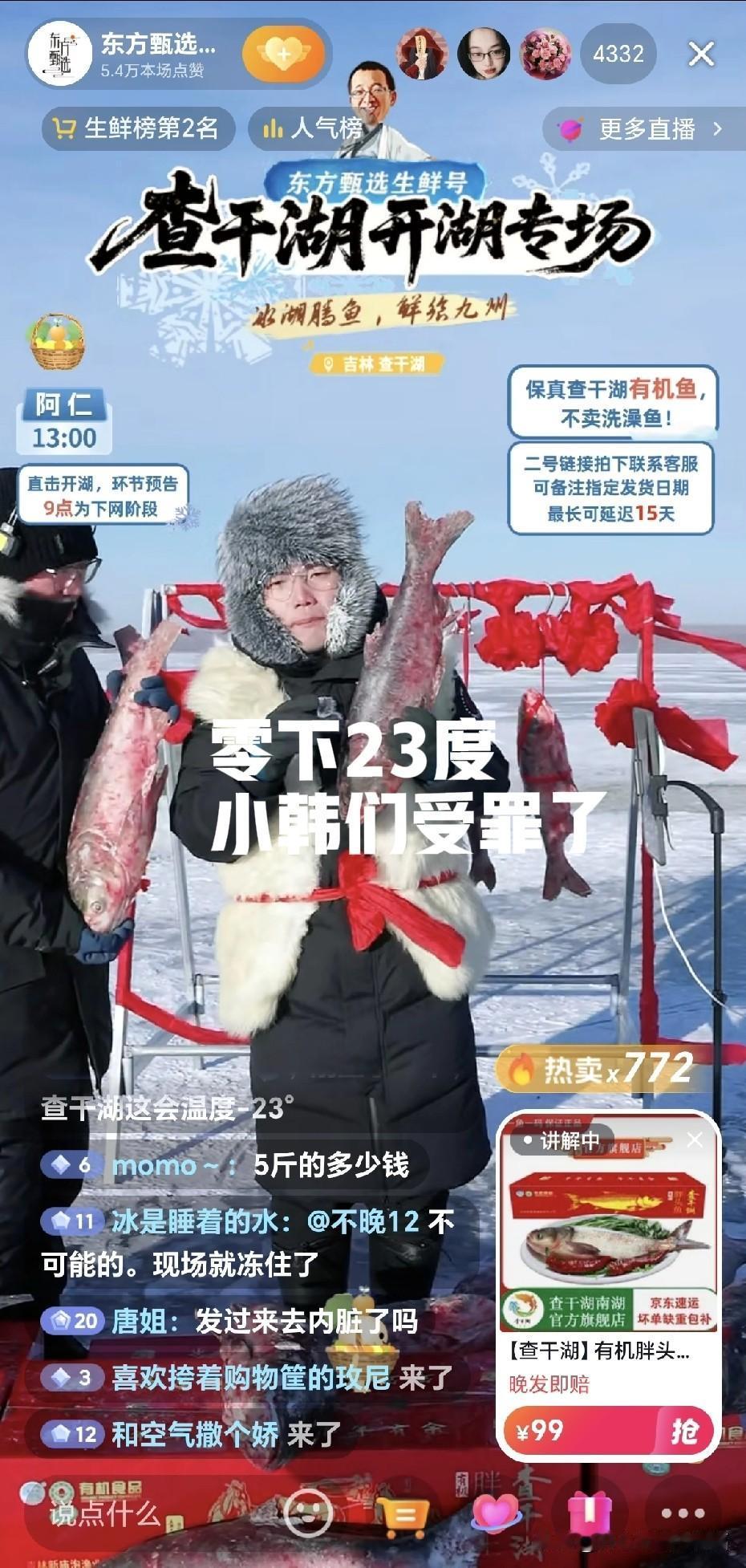 摆摊丢人吗?摆摊才能真正看到产品最初的模样,摆摊才能保证消费者吃到健康的食材,闭眼入是无数东方甄选人背后默默地坚守。 零下23度,真不容易,这么冷的天在空旷的雪地里一站就是几小时,在夏天和冬天摆过摊的都知道其中的滋味。辛苦了小韩和团队的小伙伴。 东方甄选很少卖这种大鱼,一看到胖头鱼就想起了妈妈给我们做的红烧鱼,配上白白的米饭,香极了。我们家虽然不在海边,但离海边不远,集市上都是卖小鱼小虾的,所以我从小就爱吃鱼。 今天小韩在零下23度的查干湖卖正宗的胖头鱼,怎能不下一单?
