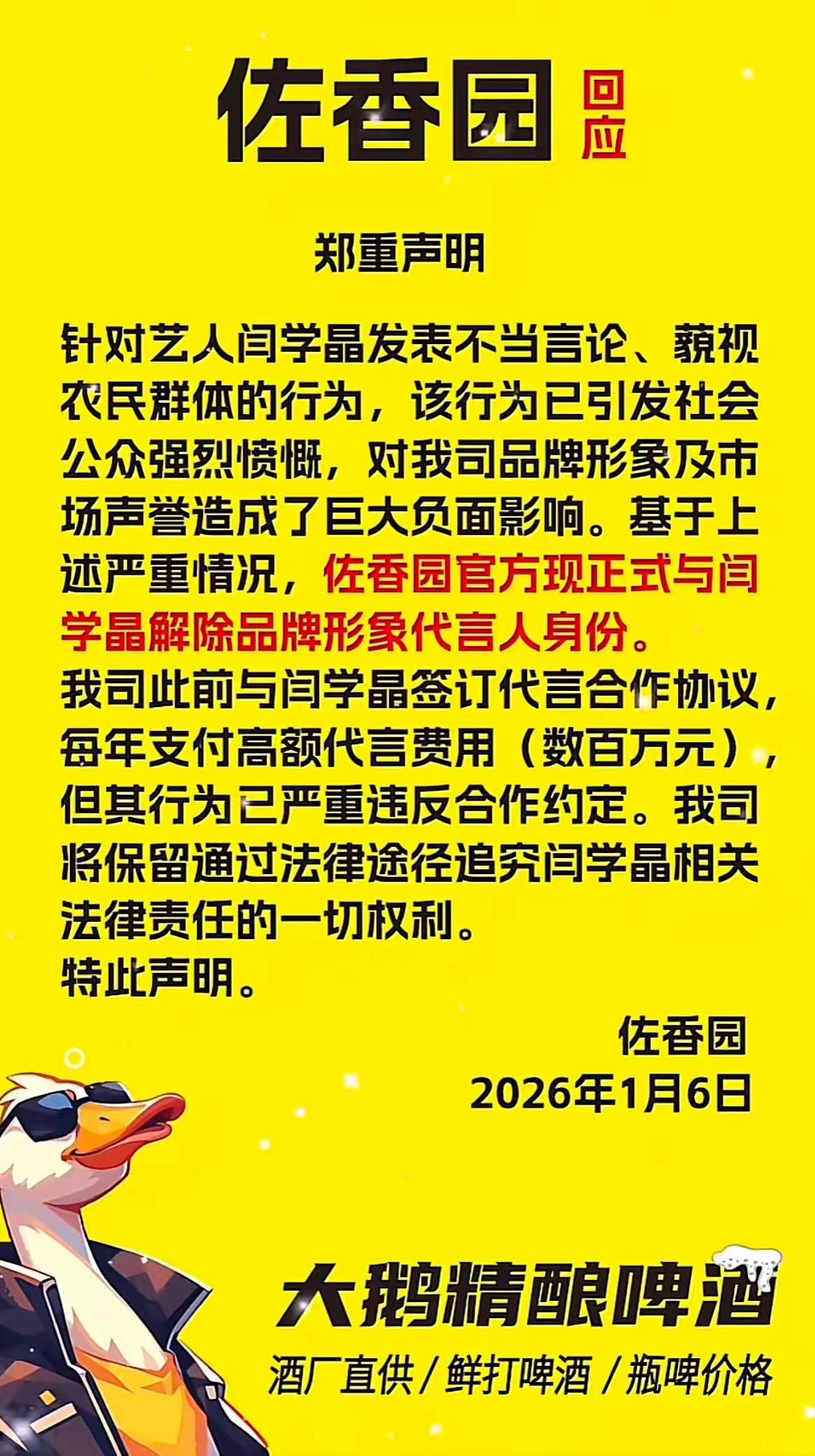 来了来了,最终佐香园还是没顶住压力!把闫某晶解约了。 你别说佐香园还挺会总结,说某老师藐视农民群体,哎呦,城市里也有一年赚不到三四十万的群体啊,不光农民群体啦!她这一杆子呼噜倒了一大片啊!数百万元,听听,数百万元一年啊!可见这个东西多么赚钱!这都不珍惜,狂成啥样了! 广大网友操碎了心,这下可以继续吃佐香园大酱了,那些扔垃圾桶的,回去翻翻,没准儿还能找到,就继续吃吧!没有了就赶快买几袋,支持一下站在老百姓这边的土品牌。佐香园 笑不活了,处理的挺快!谢谢大酱哦!