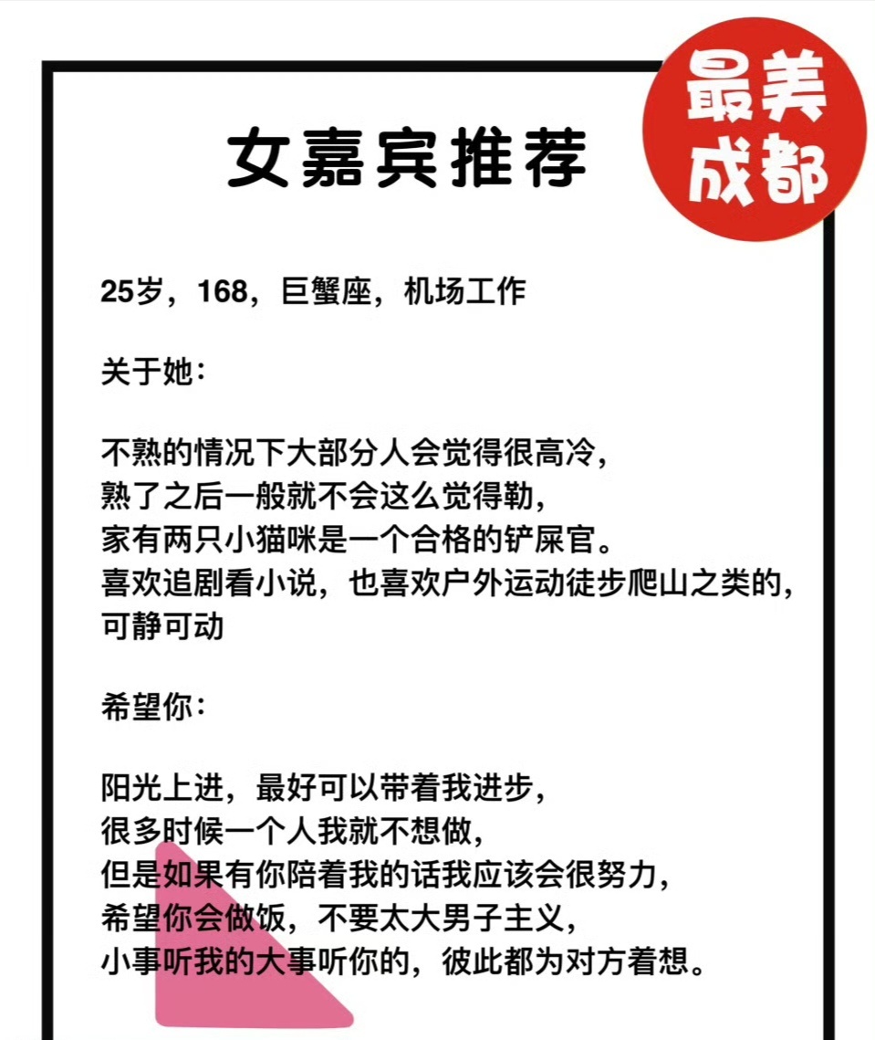 成都征婚【第7532号】00年女生,身高168,机场工作;可静可动,喜欢追剧/徒步/旅行。希望男生阳光上进,最好会做饭,带着我进步,小事听我的大事听你的… 详情戳图↓特约嘉宾——有意者请私信小美,投稿/加群/周末相亲会/小红娘1V1牵线 请私信! 成都征婚成都相亲