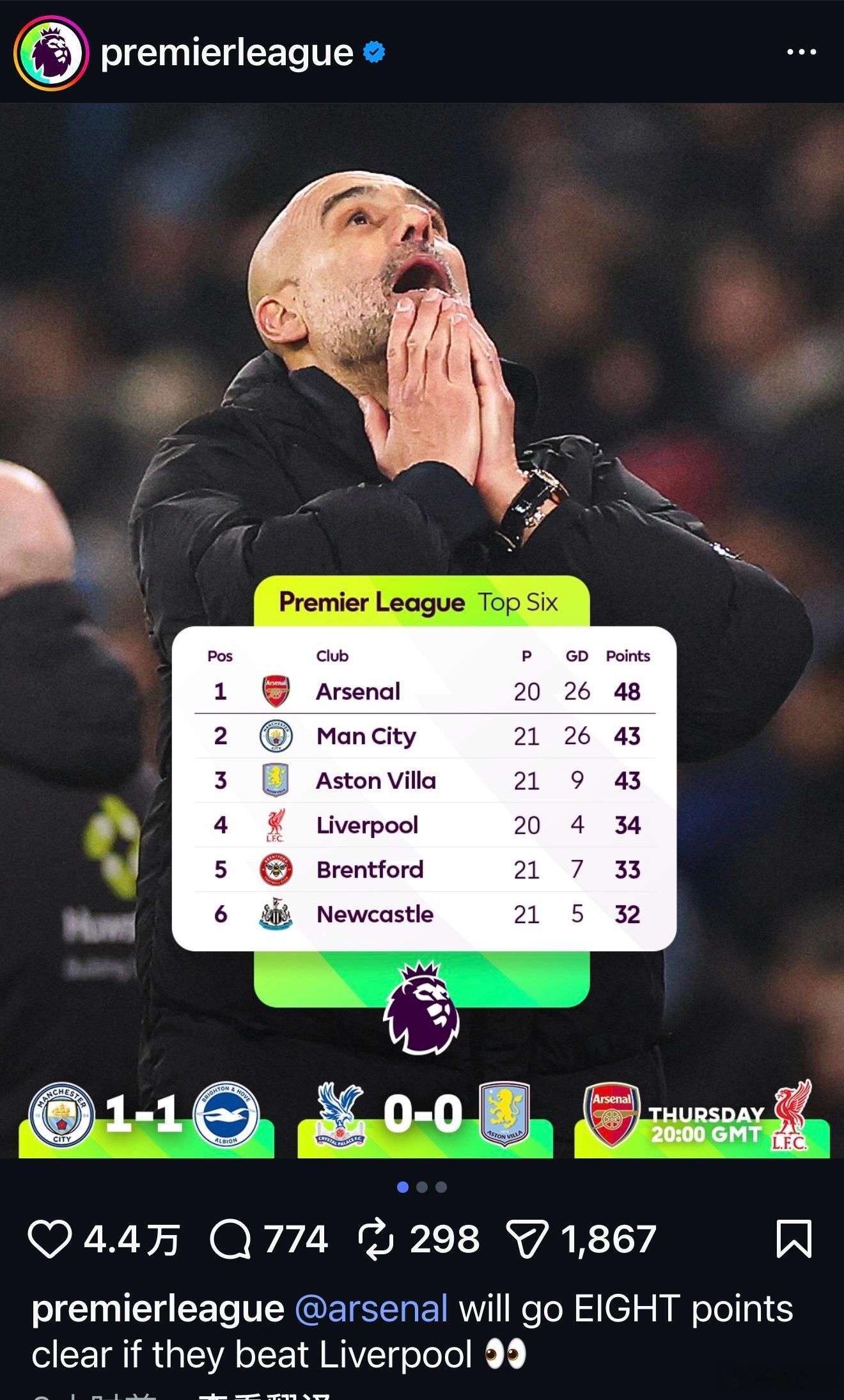 英超联赛的几大官方社交媒体同时发文:如果明天阿森纳击败利物浦,他们在积分榜上的领先优势将扩大到8分。这算奶一把阿森纳?还是“保厂杯”实锤呢?英超