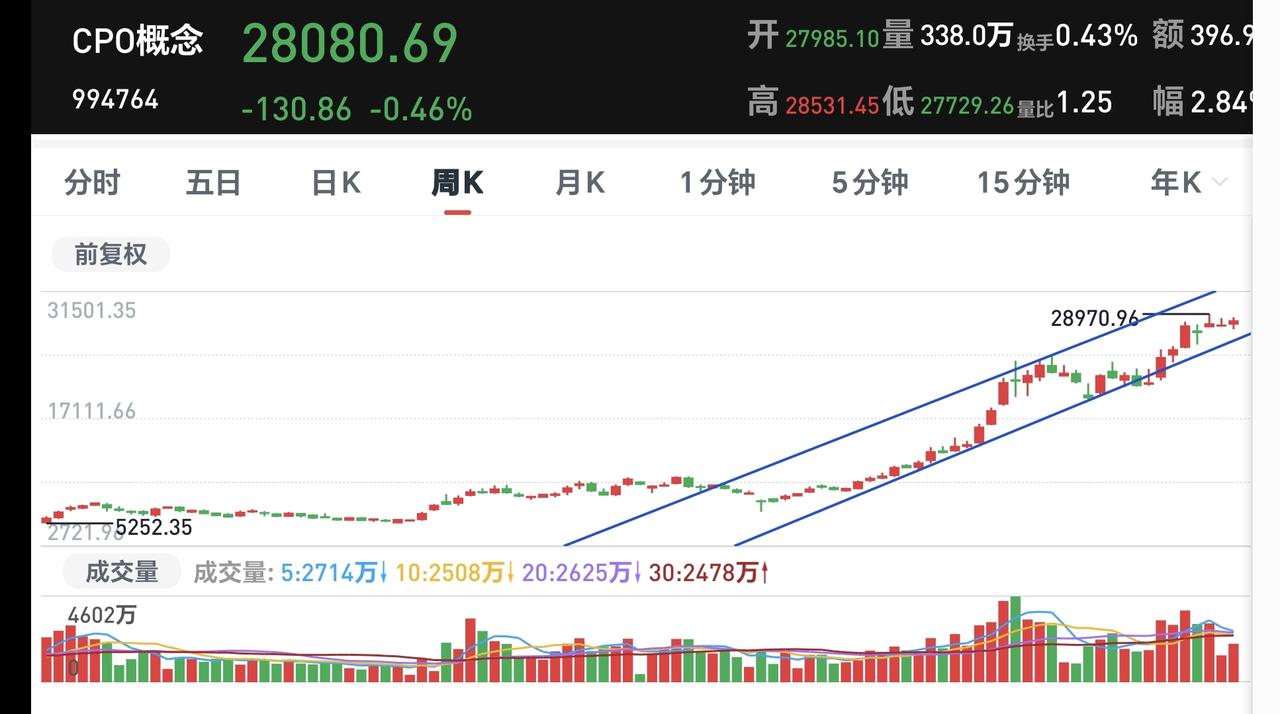 基金:Cpo板块可不可以继续持有 今天市场低开以后小幅度震荡走高,中午收盘的时候三大指数涨跌不一,创业板指和深成指小跌,上证指数小涨,创业板指下跌了0.52%,收于3312点,上证指数上涨了0.09%,收于4089点。 今天上证指数虽然是小涨,但这也是15连阳,另外,今天上证指数是低开,开盘点位4077点,所以,今天只要收盘点位在4077点之上,就是15连阳,今天15连阳是大概率的事情。 今天上午,两市累计成交17650亿,相比于昨天数量的4%,这样的成交量还是可以的,并没有大幅度的数量,只要成交量平稳,只要成交量没有急剧的放大或者是缩小,都是没有大问题的。 我们来看一下下面的截图6,这是主力资金进出板块的情况,主力资金净流入最多的三个板块是:人工智能板块,云计算板块,计算机板块,主力资金净流出最多的三个板块是:蓝筹策略板块,esg板块,高端制造板块。 持有的基金中,估值上涨幅度最大的三个板块是:军工板块,芯片半导体板块,先进制造板块,下跌幅度最大的三个板块是:证券板块,大消费板块,白酒板块,估值整体亏损了232元。 Cpo板块今天小幅度调整,中午收盘的时候估值下跌了0.80%,这个板块今天加仓排行榜见下面的截图10,持有人数排行榜见下面的截图11,加仓人数最多的是财通成长优选混合,持有人数最多的是中航机遇领航混合。 我们来看一下下面的截图12,这是cpo板块日K线图,从图中可以看出,我画了两条倾斜向上的斜线,这是cpo板块日线级别上涨通道,现在的位置处于这个上涨通道中,也就是说,cpo板块日线级别处于上涨趋势中,持有的人可以继续持有,除非跌破这个上涨通道的下轨,才可以考虑要不要止盈出来观望。 我们来看一下下面的截图13,这是cpo板块周K线图,从图中可以看出,我画了两条倾斜向上的斜线,这是cpo板块周线级别上涨通道,现在的位置也是处于这个上涨通道中,也就是说,cpo板块周线级别也是处于上涨趋势中,持有的人可以继续持有,除非跌破这个上涨通道的下轨,才可以考虑要不要止盈出来观望。 还有哪些板块需要讲解的,请大家评论区留言,我会挑选讲解。 我每天都会分享我的观点,我的观点只代表我个人的看法,不能作为你操作的依据,据此操作后果自负。