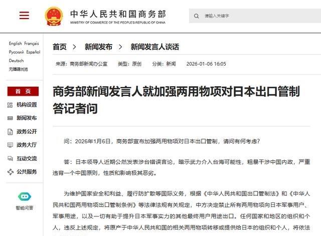 不搭理,日本想找中国谈!在中国宣布对军民两用物项出口至日本进行管控之后,日本政府以及日本国内民众感受到了危机,不少人提出希望高市早苗立即道歉,并寻求中国民众的谅解,否则日本经济将陷入泥潭。然而,事情远远没有那么简单,根据不少消息人士透露,中方正在研究收紧对日本稀土的出口许可审查。 高市早苗2025年10月当选日本首相后,在11月国会答辩时提到,如果台湾地区发生使用武力的情况,可能构成日本的存亡危机事态,自卫队可以行使集体自卫权。这番话直接点燃了中日关系导火索,北京方面视之为粗暴干涉内政,严重违背一个中国原则。 中方反应很快,先是外交部多次表态批评,然后层层升级。2026年1月6日,商务部直接发2026年第1号公告,加强两用物项对日本出口管制,禁止所有这类物品向日本军事用户、军事用途出口,还包括任何有助于提升日本军事实力的最终用户或用途。公告强调,任何国家和地区的组织或个人要是把中国产的相关物项转给日本,也要承担法律责任。这措施当天就生效,没留缓冲期。 两用物项范围广,目录里上千项,涵盖化学品、电子器件、传感器、激光器、航空材料,还有稀土相关产品。日本那边马上慌了,因为很多高端制造和国防装备离不开这些东西,尤其是某些中重稀土元素,日本依赖度很高。企业界开始评估库存,股市相关板块波动明显。政府层面,内阁官房长官出来说这措施只针对日本,不符合国际惯例,完全无法接受,外务省也紧急抗议,要求撤回。 日本国内舆论分化,有人觉得首相言论太冲动,害得经济受牵连,企业协会和部分民众呼吁政府调整立场,尽快对话缓和。经济产业省内部在算账,担心供应链中断会拖累新能源汽车、精密仪器和半导体项目进度。东京那边,官员连夜联系中国使馆,递交正式抗议书,但中方立场没松动。 事情到这步,日本想谈的心思很明显,好几个经济团体之前就放风要访华,但没得到积极回应。现在管制一出,压力更大,不少人觉得只有外交渠道或者高层亲自出面,才有可能缓和。否则,新能源和芯片产业真要吃大亏。 其实日本这些年一直在推稀土多元化,依赖度从以前九成多降到六成左右,但关键重稀土还是卡脖子。野村研究所估算过,如果供应中断几个月,损失就上千亿日元,GDP小幅下滑。企业得额外证明用途才能申请许可,审批周期不确定,生产计划全乱套。 中方这次出手,商务部发言人直言就是针对日本领导人涉台错误言论,性质恶劣。公告依据出口管制法,维护国家安全和防扩散义务,合法合规。日本扩军动作也多,2026财年防卫预算创纪录,还计划买无人机、研发隐形战机,这些都需要稳定供应链。 中日在这件事上互动进入新阶段,日本想减少单一依赖,中国坚持原则。双方经济深度绑定,日本进口中国货占比高,企业民众都希望别继续恶化。管制刚开始,具体影响还得观察,日本会不会调整立场,也看后续动向。总之,这事提醒大家,关键物资供应链有多脆弱,大国间一句话,就能牵动整个产业神经。