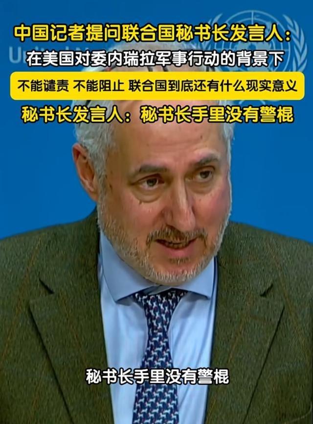大快人心!中国记者直戳联合国秘书长心窝子,美国都上门绑架别国总统了,联合国还有存在的意义吗? 不得不说,这哥们提的这个问题很犀利也很现实,是很多人都想问的一个问题,他当着全世界媒体的面直接把这个问题摔到了联合国秘书长发言人的脸上,不管得到的答复如何,这哥们都已经替全世界人民出了一口气。 2026年1月3日凌晨,美国突然对委内瑞拉发动大规模军事打击,直接派特种部队进入加拉加斯,抓走现任总统尼古拉斯·马杜罗和他的夫人西莉亚·弗洛雷斯,把他们押送到纽约。这事一出,国际社会炸锅了。中国外交部马上表态,严重关切美方这种明显违反国际法和联合国宪章的行为,呼吁立即释放马杜罗夫妇,确保他们人身安全,通过对话解决问题。俄罗斯、古巴、伊朗等国也强烈谴责,说这是侵犯主权。拉美国家像哥伦比亚、巴西、墨西哥都发声批评,指出这威胁地区和平。欧盟和一些欧洲国家呼吁克制,但没直接硬刚美国。 联合国这边反应也挺快,古特雷斯秘书长表示震惊,说这树立危险先例,违反国际法规则。安理会紧急开会,中国代表孙磊列出美国违反宪章多项原则,得到多个国家支持,但美国一票否决,啥实质决议都没通过。联合国副秘书长在会上宣读声明,强调宪章禁止使用武力侵害别国领土完整和政治独立。 几天后,1月5日联合国例行记者会上,央视驻联合国记者徐德智直接问秘书长发言人迪雅里克:在美军对委内瑞拉采取这种行动背景下,联合国到底还有什么现实意义?迪雅里克回答说,安理会成员多次强调各国要遵守宪章和条约,但秘书长没有强制手段,只能靠成员国自觉履行承诺。这话听着挺无奈,暴露了联合国在五大常任理事国尤其是美国面前的局限性。因为安理会任何行动都需要五常一致,美国自己就能堵死所有针对它的动议。 这事说白了,又一次戳中了联合国的软肋。联合国成立这么多年,本来是为了维护和平、尊重主权平等,可每次碰到大国尤其是美国单方面行动,就只能发声明、开会讨论,到头来啥都拦不住。像这次,美国以打击毒品为名,直接跨境抓一国元首,还宣布要管理委内瑞拉过渡,这不就是霸权吗?国际法和宪章在强国眼里成了摆设。发展中国家看着都寒心,很多小国私下估计更担心,下一个会不会轮到自己。 联合国有道义平台作用,能记录暴行、发声谴责,但没硬权力制约超级大国。改革呼声又起,可短时间内难改。像徐德智这样的记者,继续在现场追问,才让这些问题不被遗忘。很多人看完这新闻,都觉得中国记者牛,敢说真话,替弱国发声。希望国际秩序别总这么一边倒,多点公平才好。