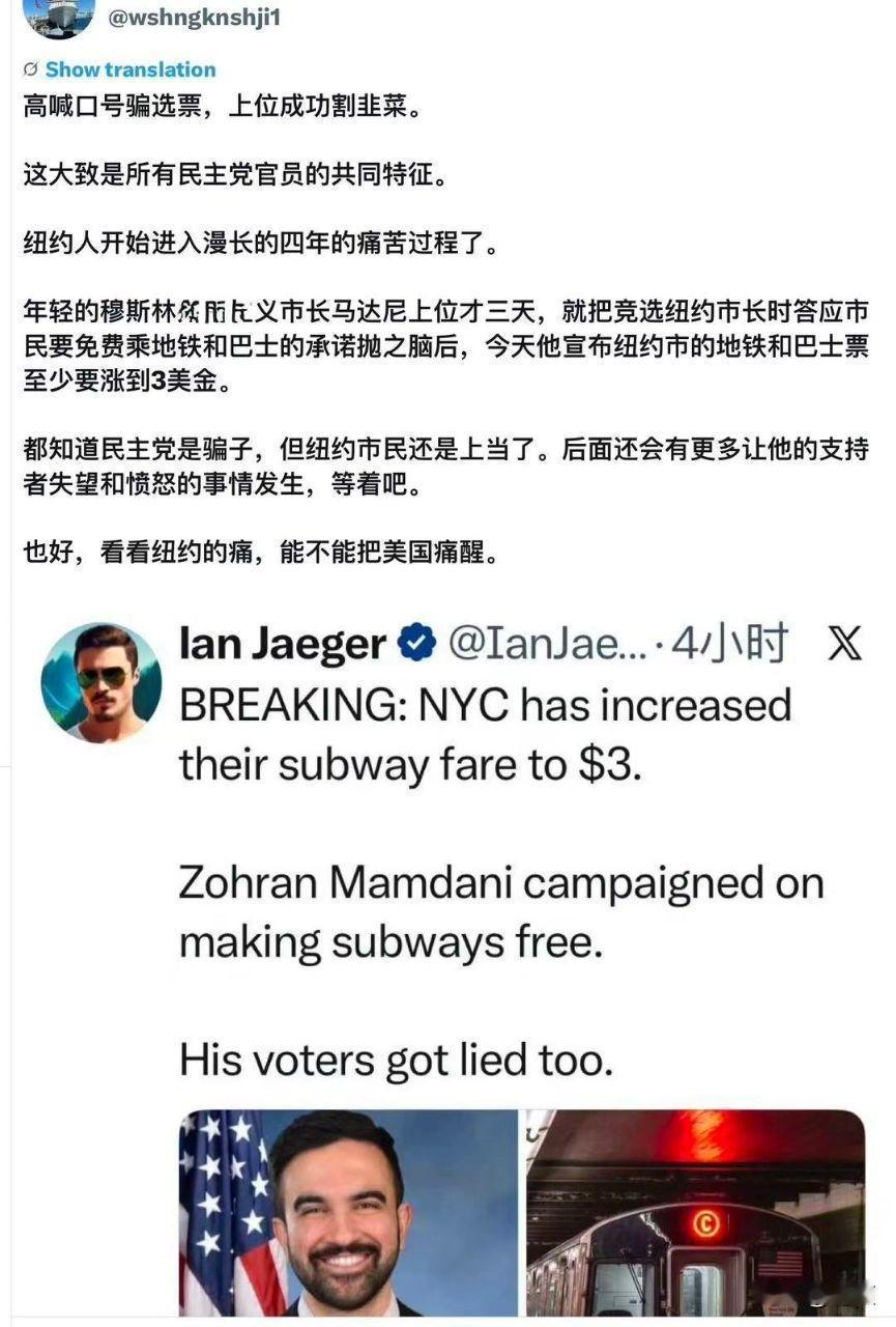 33岁的马达尼堪称纽约政坛“狠角色”:7岁移民美国,印度穆斯林后裔的他身为什叶派,不仅强烈支持巴勒斯坦,还放话若当选就逮捕内塔尼亚胡,靠着激进立场拿下民主党初选。 可这位敢对外国政要放狠话的新市长,上任仅三天就暴露了“双面面孔”——彻底推翻竞选时“免费地铁巴士”的承诺,直接宣布票价涨至3美金。一边喊着反以口号赚足政治噱头,一边转头就对纽约市民“割韭菜”,民主党官员的套路在他身上体现得淋漓尽致。 纽约选民本以为选到了“反建制”的硬茬,没想到等来的却是又一个言而无信的政客。