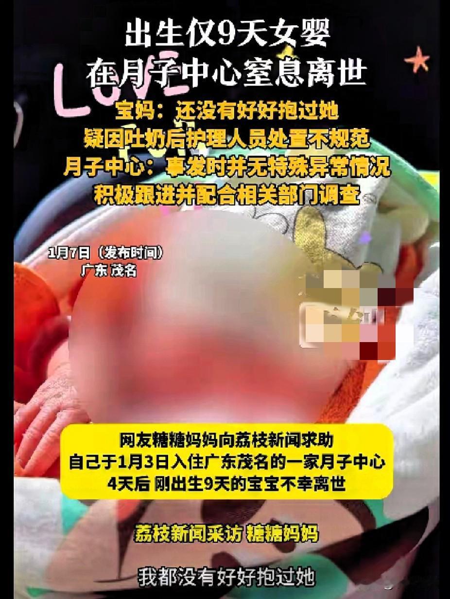 广东:婴儿入住月子中心4天窒息死亡, 近日,广东茂名一家月子中心,分娩出生9天的婴儿窒息死亡。 据婴儿妈妈透露出:从工作人员告知婴儿不舒服,到妈妈看见婴儿5分钟时间,婴儿就已经没有呼吸了。 据其提供的死亡证明显示,宝宝的死亡原因为“新生儿窒息”。 糖糖妈妈透露,婴儿出现吐奶的时候,月子中心的护工正规流程,导致婴儿吐奶加重,最婴儿被包出了监控大概二十分钟, 涉事月子中心的工作人员表示,在遇到喂奶,换尿不湿时,会离开监控一段时间, 据工作人员介绍,月子中心正在积极跟进该事件,当地公安、社区、卫健部门等也已介入调查,正在等待相关鉴定结果。