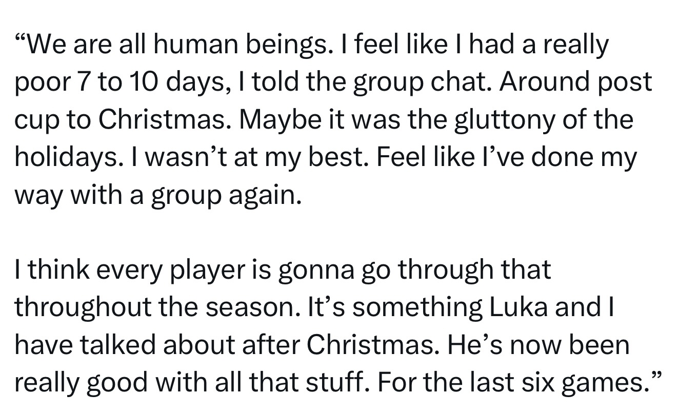 雷迪克谈湖人的进步:“我们都是普通人。我意识到自己在季中锦标赛到圣诞节期间大约有7到10天状态很差,我在群聊里也提过这事。也许是节日期间的放纵影响了状态,我那段时间确实不在最佳水平。现在我感觉自己已重新与团队步调一致了。我相信每个球员在赛季中都会经历这种阶段。这也是我和卢卡在圣诞节后讨论过的话题——最近六场比赛里,他在肢体语言和非篮球层面的领导表现上做得非常出色。”