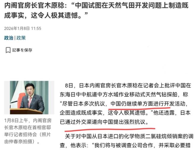 日本再次出来表态!1 月 8 日,日本内阁官房长官木原稔在记者会上称,中国在东海日中 “中航道”,中方水域作业移动式天然气钻探船一事,尽管日本多次抗议,中国仍继续 “单方面” 进行开发活动,“企图” 造成既成事实,这令人极其遗憾。日本已通过外交渠道向中国提出强烈抗议。 说实话,日本的这一抗议纯属没事找事。我们在自己的经济海域进行勘探,开采,这完全合情合理。 根据《联合国海洋法公约》,沿海国家有权在领海基线外 200 海里范围内设立专属经济区,在这个区域内享有勘探、开发自然资源的主权权利。 而中国的《专属经济区和大陆架法》也明确规定,中国的专属经济区从领海基线量起延至二百海里,大陆架则依陆地领土自然延伸确定。 中方此次作业的 “中航道” 中方水域,本身就处于中国管辖的无争议海域,这一点中国外交部早已多次明确回应,强调相关开发活动是中方主权权利范围内的事,不接受日方无端指责。 日本之所以频频抗议,关键在于双方在东海划界问题上的根本分歧。 日本一直坚持所谓的 “中间线” 原则,认为应在中日海岸之间划定一条等距离线,以此划分专属经济区。 但这个 “中间线” 完全是日本单方面提出的,既没有国际法依据,也从未得到中国的承认。 从地理上来说,东海平均宽度仅 210 多海里,中日两国若都主张 200 海里专属经济区,必然会出现重叠区域,而解决这种重叠的合理方式应遵循公平原则和大陆架自然延伸原则。 中国东海大陆架是中国大陆领土的自然延伸,直到冲绳海槽才终止,这是客观的地理事实,按照国际法,中国对这片大陆架及其资源享有无可争辩的主权权利。 日本的 “中间线” 主张,本质上是无视地理现实和国际法基本准则,试图侵占本应属于中国的海洋权益。 回顾历史,中日在东海能源开发上的摩擦早有先例。 早在 2004 年,中国开发春晓油气田时,日本就曾以所谓 “吸管效应” 为由大肆炒作,声称中方开发会吸走 “中间线” 另一侧的日本资源。 如今类似的抗议再次上演,不过是故技重施。 从 2025 年 6 月开始,日本就多次就中国在东海的资源开发活动提出抗议,仅 2026 年开年不到一周,就已经是第二次发难。 但无论日本如何抗议,中国的开发步伐从未停止,目前已在东海确认建造 20 座相关设施,这些设施的建设和运营都严格遵循国际法和中国法律,完全是合法合理的正常经济活动。 日本此次高调表态,背后的考量远不止能源利益那么简单。 东海不仅蕴藏着丰富的天然气、石油等资源,据估算其天然气储量足够日本消耗百年以上,更是重要的海上交通要道,日本依赖的 “西南航线” 就途经此地,这条航线是日本获取能源、输出产品的生命线。 对日本而言,控制东海部分海域的话语权,既关乎经济安全,也关乎战略安全。 更值得注意的是,日本前海上自卫队幕僚长武井智久曾直言,日本可能会试图将这一双边争议 “国际化”,争取国际社会支持,这种做法无疑会让问题更加复杂难解。 但国际社会都清楚,东海问题的核心是划界分歧,而解决分歧的唯一正确途径是通过双边谈判。 2008 年中日曾达成过东海天然气田共同开发协议,但后续磋商进展有限。 中国一直坚持落实东海问题原则共识,希望日方相向而行,重启政府间谈判,而日本却频频以抗议施压,这种做法显然不利于问题的解决。 事实上,日本所谓的 “中方单方面开发” 完全站不住脚,中国在开展相关活动时,始终秉持着合理合法、公开透明的原则,反而日本单方面提出 “中间线”、频繁炒作争议,才是破坏东海和平稳定的主要因素。 从国际法层面来看,日本的抗议缺乏任何法律支撑。 《联合国海洋法公约》明确赋予沿海国家在专属经济区内开发自然资源的主权权利,中国的做法完全符合公约规定。 而日本既不承认中国的大陆架自然延伸权利,又强行推行自己的 “中间线” 主张,这种双重标准的行为,本身就违背了国际法的公平公正原则。 中国生态环境部此前已对东海 QY 气田北区开发项目进行了环境影响评价文件审查公示,整个过程公开透明,充分体现了中国对海洋环境和国际规则的尊重。
