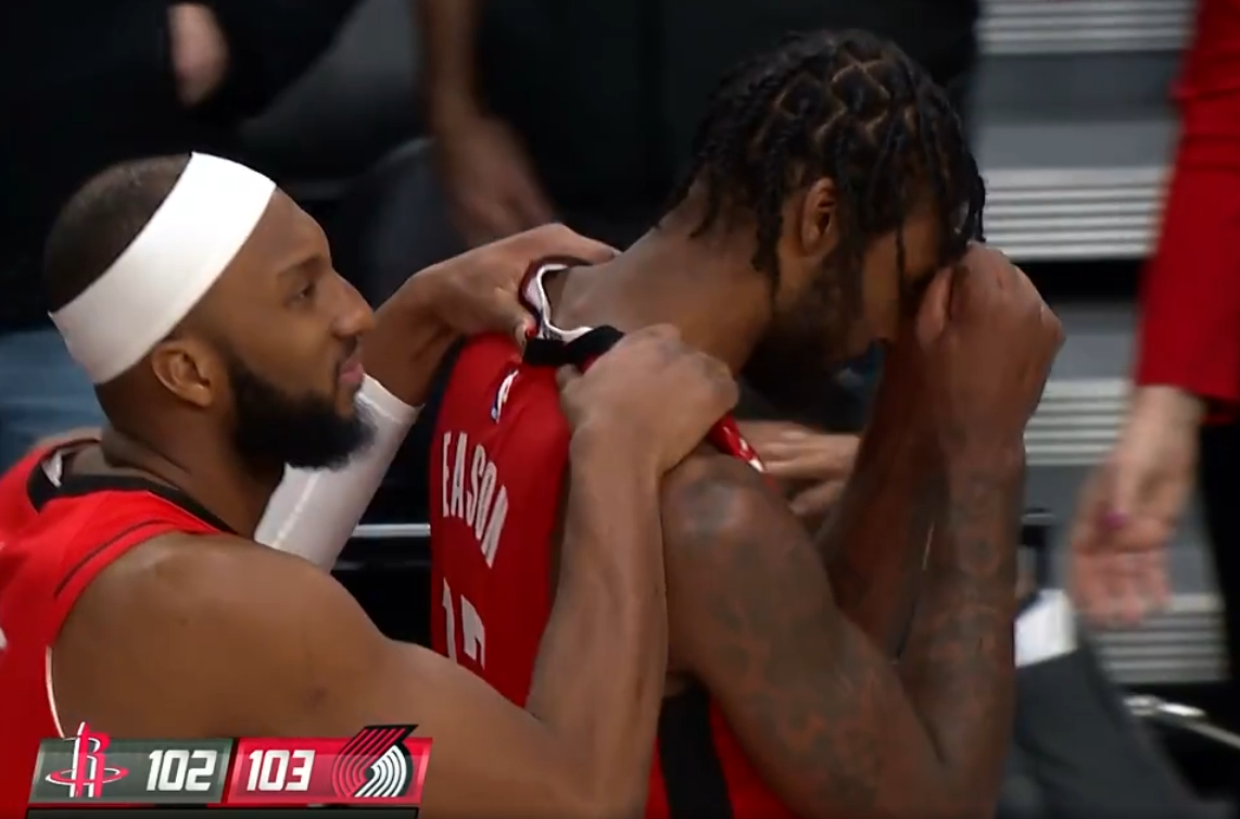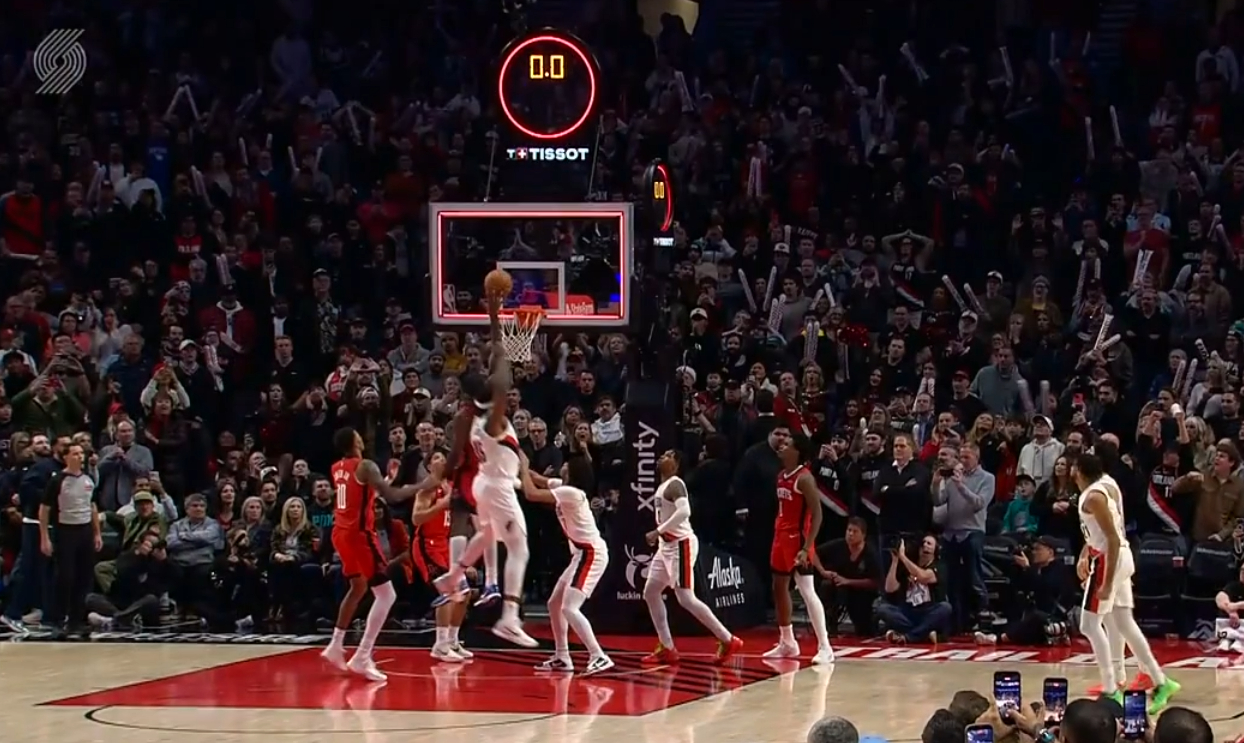 塔里伊森补篮进了,回放显示,球还在手尖,进球无效,开拓者1分险胜火箭,火箭掉到第