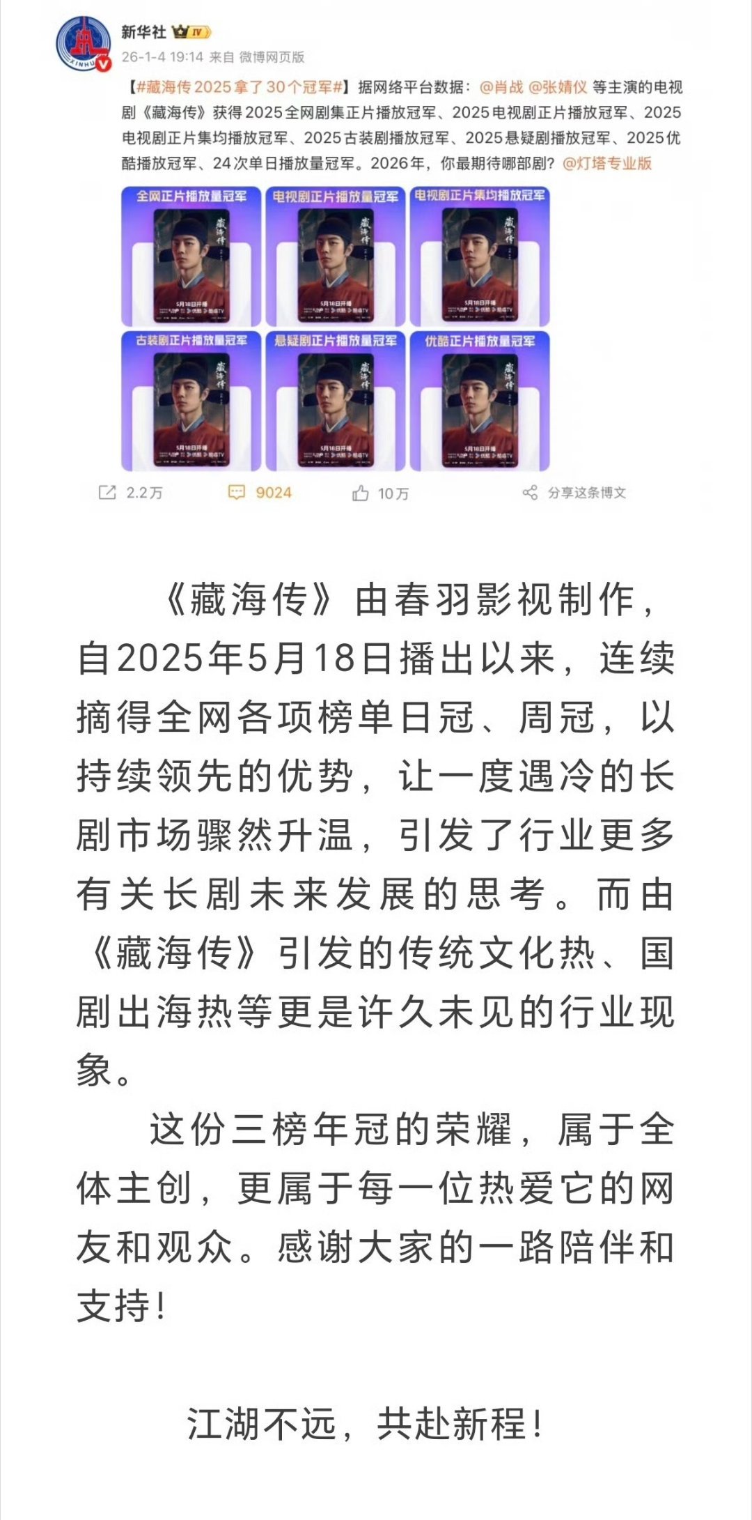 春羽:喜报来了,藏海传包揽云合猫眼灯塔三榜年冠,引发了传统文化热,国剧出海热等行业现象 2025央八收视前十