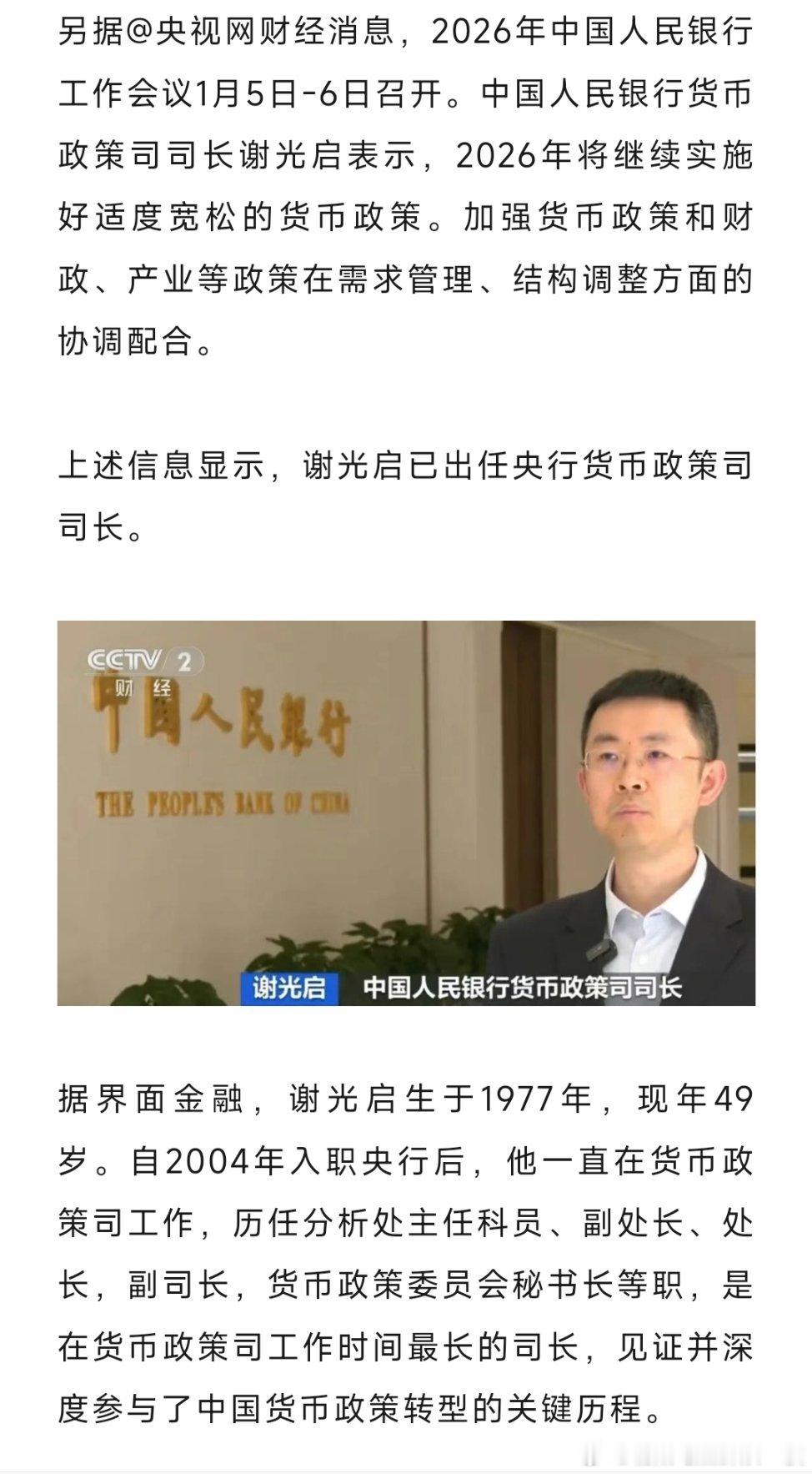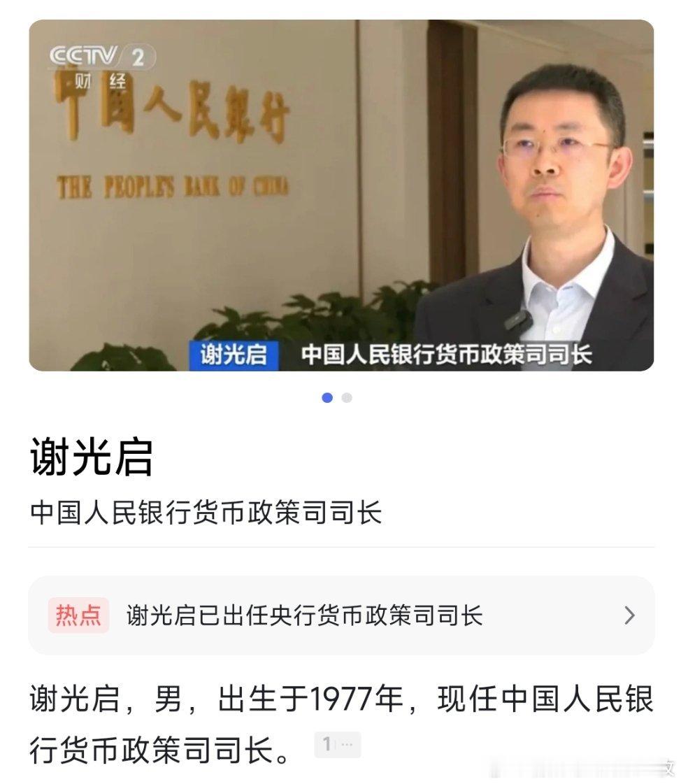 谢光启已任央行货币政策司司长。
