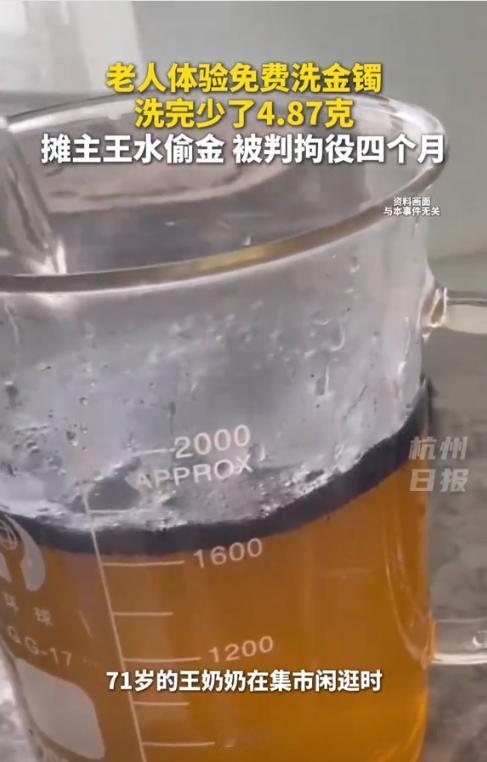 “太缺德了!”近日,浙江台州,一71岁的老人在集市闲逛时,被路边摊“免费清洗金饰”的吸引,对方称自己的金手镯脏了,可以免费清理,于是她便将将佩戴多年的金手镯交给摊贩处理,结果回家后就感觉手镯好像变轻了,上称一称果然少了4克多,于是老人立即报警。网友:免费的才是最贵的! 据媒体1月7日报道,当天,老人逛集市时,被一名摆摊的男子主动搭话说她的金手镯有点变形还脏了,愿意免费帮忙敲圆清洗,洗完跟新的一样,老人想着不用花钱还能保养首饰,于是便卸下金手镯交给了对方。 对方先将手镯敲圆整形,随后放入一个装有淡黄色液体的瓷碗中浸泡了二三十秒,捞出擦干后交还她,老人也感觉洗完后特别感觉,满是开心。可回家后却发现不对劲——手镯戴在手上明显变轻,而且原本光滑的表面变得有些粗糙,质地也比之前软了不少。 于是她赶紧找出称称了一下重量,结果显示手镯仅重23.13克,卖的时候可是28克足足少了4.87克,接近5000元。意识到被骗的李奶奶又气又急,当即在家人陪同下报警。 民警调取集市监控后迅速锁定嫌疑人,将其抓获归案。面对证据,嫌疑人如实供述了作案事实:他以“免费清洗”为幌子,将顾客金饰浸泡在“王水”中溶解部分黄金,之后再从溶液中提炼回收,据为己有 。 街头“免费清洗金饰”多为盗窃陷阱,尤其针对老年群体。清洗黄金应选择到正规门店,清洗前后当场称重核对;遇到陌生人推销的“免费服务”要提高警惕,不要轻易将贵重首饰交给不明身份人员处理,避免财产损失。 信息来源:《
