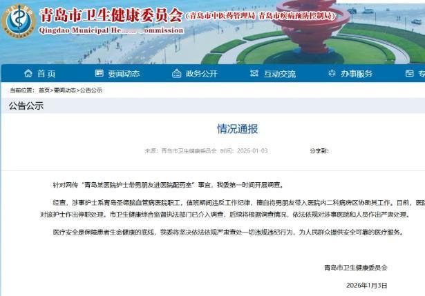 “必须严惩!”1月2日,山东青岛,一护士值夜班时,擅自将男友带进病房区,不仅让男友代写医护记录,甚至还让他直接参与配药,护士则在一旁将整个过程用视频拍下,发到网上炫耀,本想秀一波恩爱,不料却引发众怒!医院:她脑子有病! 从视频画面来看,这名护士当晚值夜班时状态十分放松,脸上不见丝毫紧张与警惕,反而多次对着镜头露出笑容,语气轻快,仿佛身处的不是病房,而是私人空间。 她的男友穿着日常便装进入病房区,手臂上的大面积纹身格外醒目,与周围洁白肃静的医疗环境形成强烈反差。 该男子既未佩戴口罩、手套等防护用品,也未接受任何消毒流程,就在病房走廊和护士站附近来回走动。 更让人难以接受的是,护士似乎早已习以为常,不仅没有制止,反而主动安排起“任务”。 画面中,她将医护记录递给男友,让其帮忙填写、誊写相关内容,自己则在一旁指点。 随后,在配药环节,护士又让男友靠近操作台“搭把手”,疑似直接接触药品、托盘及相关器具。整个过程中,护士始终举着手机拍摄,时不时对镜头说笑,配文带着明显的炫耀意味。 视频发布到网络后,原本想记录甜蜜日常的举动,瞬间引发巨大争议。 不少网友表示,医院是高度专业、极度严肃的场所,尤其是脑血管病医院,患者多为重症或行动不便人群,任何操作失误都可能造成不可逆的后果。 “这不是秀恩爱,这是拿病人的命当儿戏”“非医护人员进病房还配药,简直突破底线”等评论不断刷屏。 还有网友质疑,医院的管理制度是否形同虚设,夜班监管为何出现如此明显的漏洞。 随着舆论持续发酵,涉事医院很快作出回应。院方表示,已第一时间关注到相关视频内容,并迅速展开内部调查。 经初步核实,视频中情况属实,涉事护士在值夜班期间,严重违反医院管理规定及医疗安全制度,擅自带无关人员进入病房区。 并存在让非医护人员接触医疗文书及配药流程的行为,性质恶劣、影响极坏。 院方工作人员在接受媒体询问时情绪激动,直言:“这种行为完全不可理喻,说难听点,简直是脑子有病!” 医院方面明确表示,已对该护士作出停职处理,后续将根据调查结果,依法依规作出进一步处罚。 同时,医院已对相关科室进行全面排查,强化夜班管理和内部监督,防止类似事件再次发生。 此外,医院还强调,所有医疗操作均需严格遵循规章制度,任何无资质人员不得进入病房核心区域,更不允许参与医疗流程。 此次事件不仅损害了医院形象,也对医护群体的整体公信力造成不良影响。 目前,该视频已被平台下架,相关部门是否介入调查仍有待进一步通报。 但此事已为公众敲响警钟:医疗安全无小事,任何一次违规、一次侥幸,都可能带来无法挽回的后果。网络“秀恩爱”的代价,不应由无辜患者来承担。