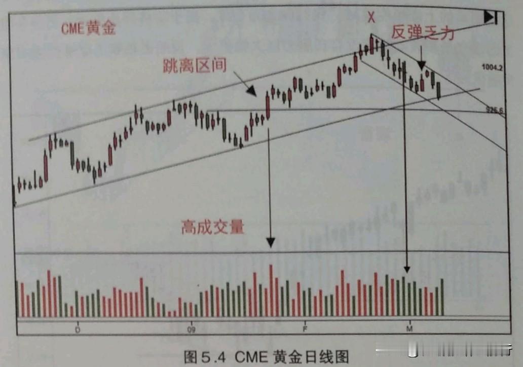 十万想变百万。今天金风又板了,牛。又买了三只票,感觉开成超市了,两只航天,一只算力。零售卖了。 每日一学:上升通道,无需求反弹交易法 如图所示,黄金处于上升轨道背景,价格上升中出现JoC(跳离区间),特点是扩大的成交量和波动幅度,这是进场的预备信号,如果出现低量回撤或者价格没有出现大幅下跌的情况,我们可以买入。 第一个跳离区间之后,出现低量回落,是进场时机。接下来的横盘是对持仓者的考验,因为这个横盘看起来非常枯燥。但是如果仔细观察,发现价格逐渐形成高支撑和递减的成交量,说明供应不足,这是明显的吸收 行为。吸收行为的另一个特点是凡是比较有威胁的下跌都立刻遇到支撑, 表明需求的抗压能力强。吸收之后的上涨秩序非常完整,每次的回落都是 低量小柱,然后继续上涨,直到突破超买线(X),这是个关键位置,如果 市场真的出现超买现象,说明需求被大量消耗,这会导致供应占上风。从 接下来的回落强度来看,三低量增告诉我们供应增加,这个回落强度打破 了上涨趋势的秩序。