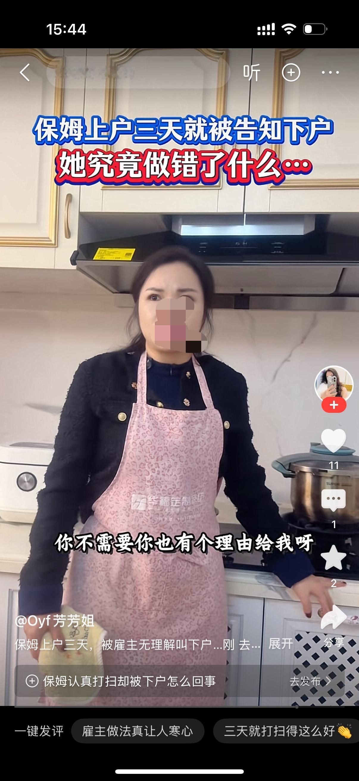 保姆正在收拾厨房。雇主过来对她说,阿姨等下你收拾收拾就下户吧。保姆一愣,怎么了,我哪里做的不好吗?雇主说,没有,只是我们不需要了。保姆很不开心,你不需要也有个理由给我呀,这个边边角角都搞得干干净净的。雇主很不耐烦地说,没什么理由,这三天试工给你工资就是了。保姆提高了嗓门,这三天可不是一般的保洁,你要发三倍的工资。雇主大怒,你是想钱疯了吧?保姆说,对啊,我就是疯了。怎么着?雇主很无语,只能给钱打发走这瘟神。