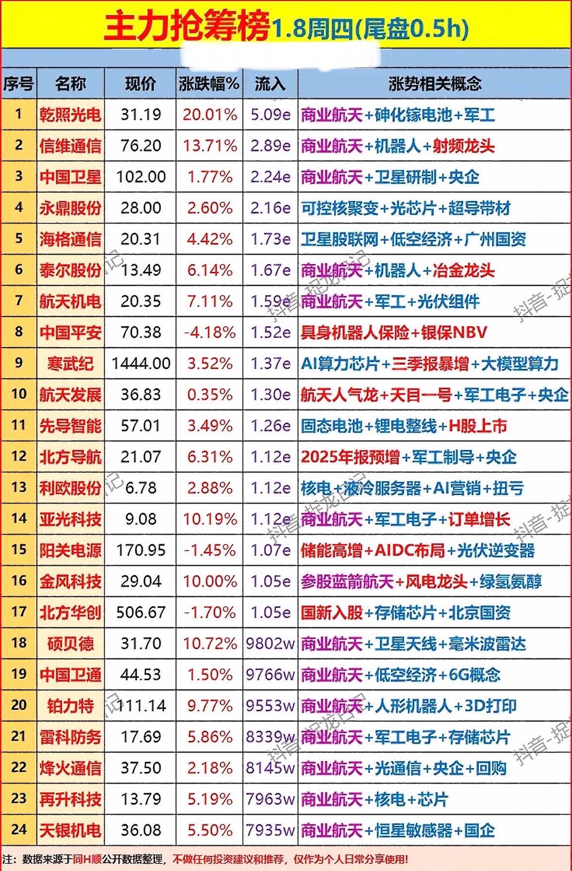 今日主力尾盘半个小时抢筹榜。 商业航天概念股强势领涨,军工、机器人、芯片等板块跟涨,主力资金抢筹明显,市场热度攀升。