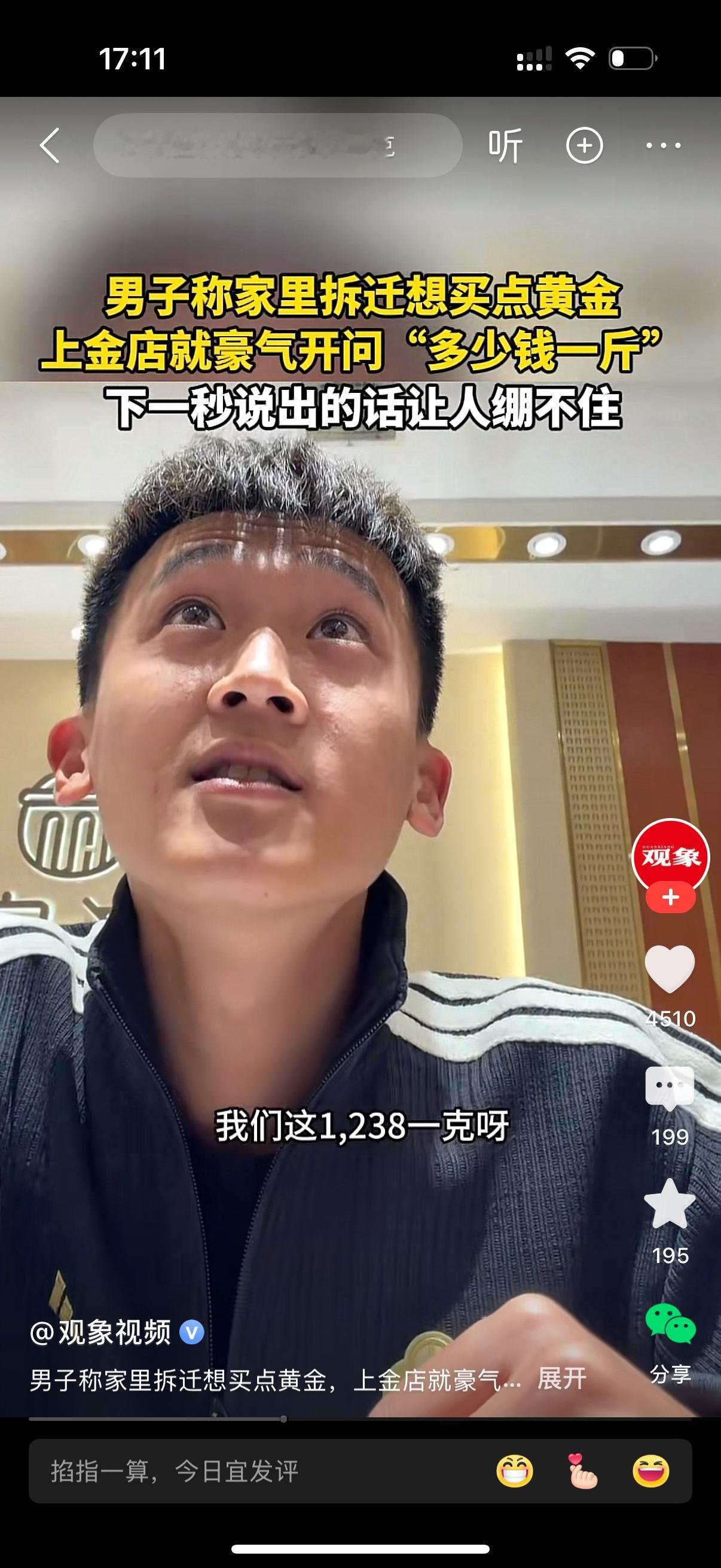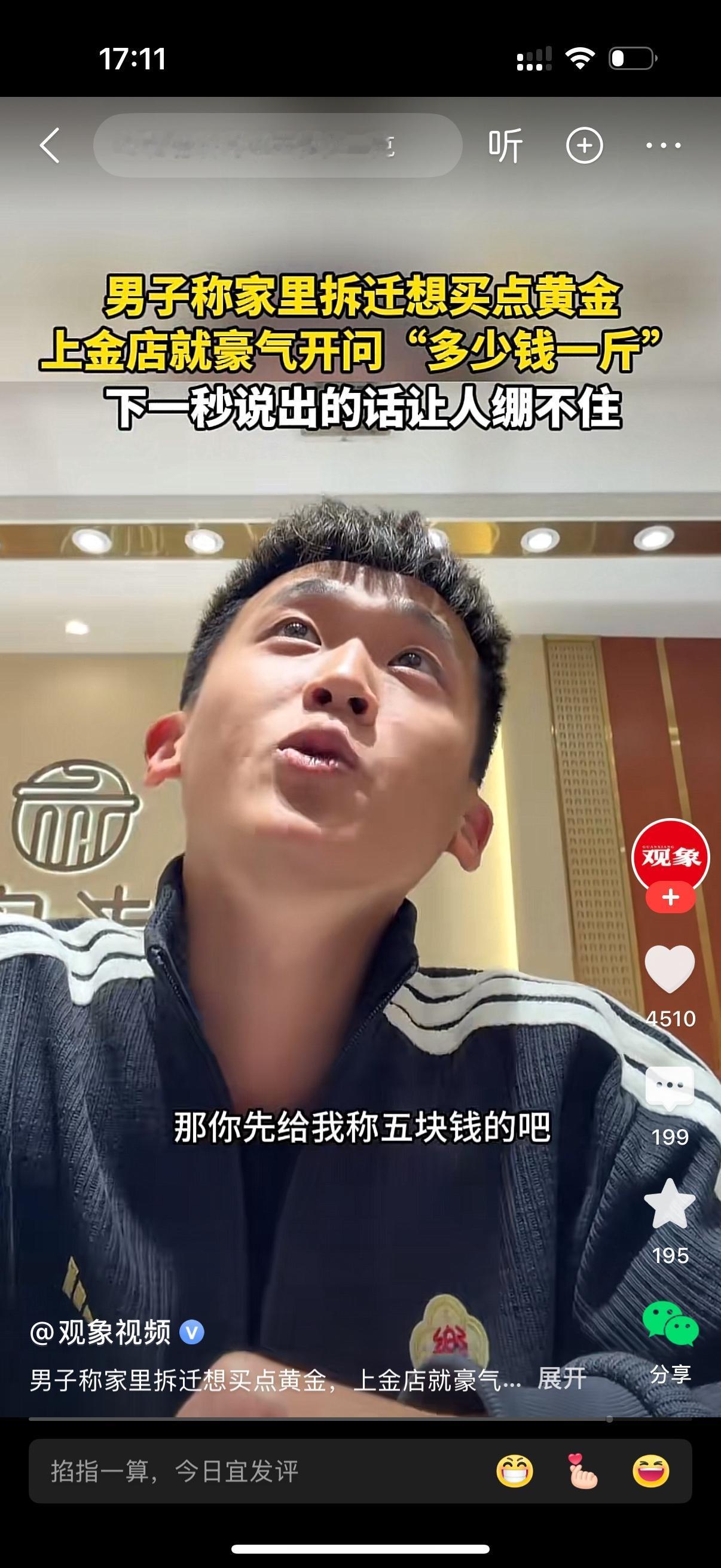 男子称家里拆迁想买点黄金。他来到金店就豪气地开问,这个多少钱一斤?店员说我们这1238一克。男子脸色有点僵硬,思考了一会,就说给我称5块钱的吧。店员愣住了,先生,我们的金是按克卖的。男子说5块钱多少克,你算一下不就行了?店员答,对不起,称的精度不够。男子说不是我不买,是你们没法称。男子扬长而去。