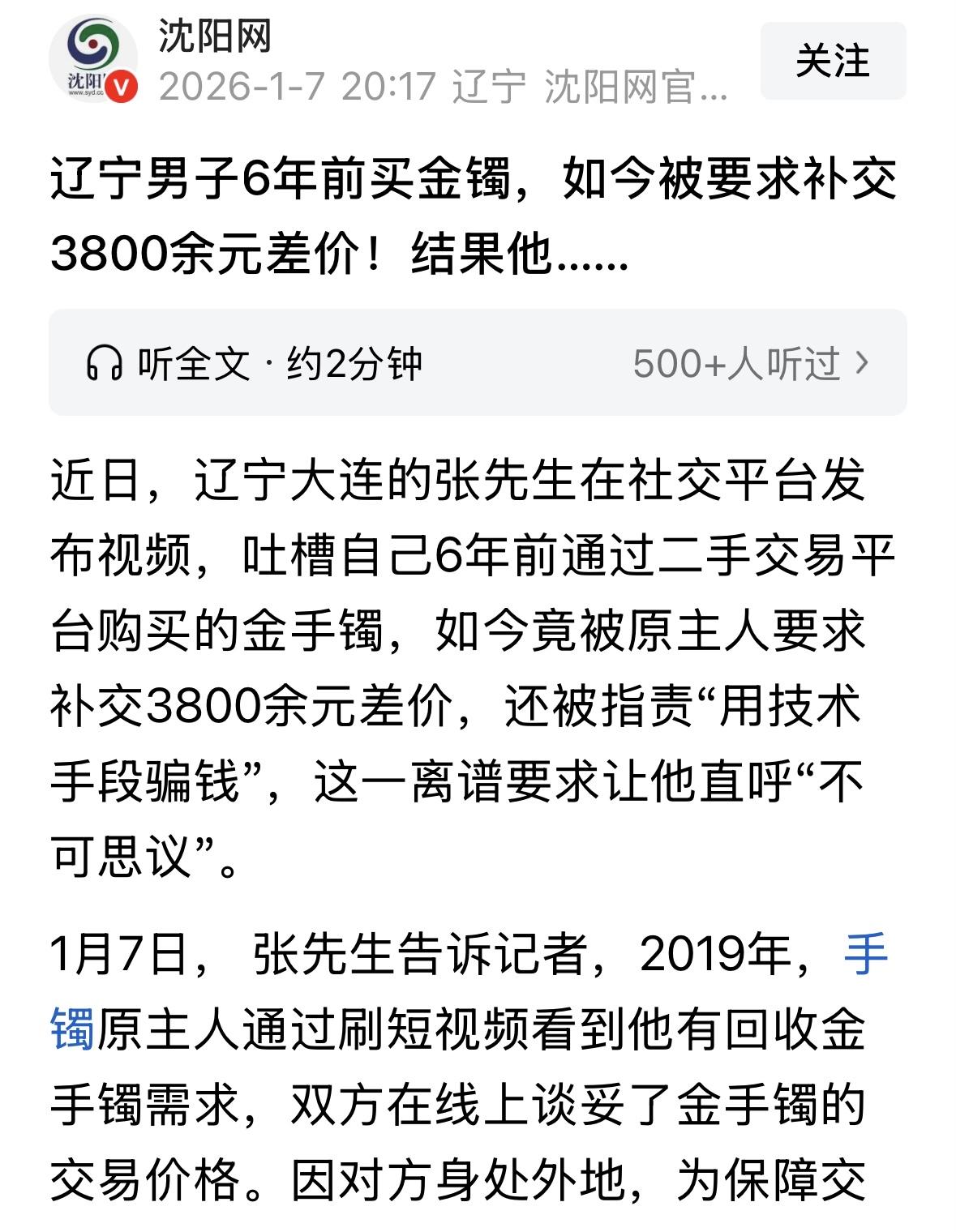 辽宁大连,男子早在2019年时,通过一二手平台买了一金手镯,下单前,他担心如果按14092元的实价发布链接,会被别人抢先拍走,就和卖家商量,先把价格抬高设定为17910元,等他下单了再修改为成交价,对方同意后,双方完成交易,原以为事情到这就结束了,谁料6年过去,卖家突然联系男子,说她发现当初的标价与实际成交价存在3800块差价,要求男子补差,这下男子傻了…… 2019年的时候,张先生在网上收金镯子。 有个外地姑娘刷短视频瞅见他的广告,就私信联系说我手上有个金镯子,你收不收? 两人在私信里你一句我一句,最后定下14092元的成交价。 可张先生心里犯了难。要是直接在平台上挂14092元,怕被别人抢拍,挂高了又怕卖家不乐意。 于是,他跟卖家商量,说妹子,你看咱能不能先把价格标成17910元,标高点,等你下单时我改成实际价格,这样安全,不然被别人抢了。 卖家当时也答应了,说行,我懂,你先拍不要付款,需要改价的时候跟我说一声。 两人就这么完成了交易。 本来这事儿早翻篇了,谁成想2025年年初,这位卖家突然联系了张先生。 对方语气特别冲地质问,说我最近查平台订单,发现当初标价和实际付的钱差了3800多块!你是不是使了啥手段多赚我钱? 对方还要求,张先生必须把差价补给她,否则这事没完。 张先生一听就懵了,6年前的老黄历,咋还被翻出来了? 他赶紧翻手机,幸好当年都有记录。微信聊天记录里清清楚楚写着双方关于“标高价、改实价”的约定。 张先生把截图发过去,卖家仔细一核对,这才说:哎呀,真是误会!当年确实是这么商量的,我给忘了! 这场乌龙细想真是让人唏嘘。张先生说,他做这行最怕说不清,所以每次交易都留聊天记录,没想到真派上用场了。 卖家后来也挺不好意思,专门打电话道歉,说自己前两天翻订单,光看着17910和14092差了3800,心里咯噔一下,以为被坑了。 她当时看差价心里不舒服,没仔细想就找张先生理论了,哪成想,是她忘了当年的情况,真是对不住。 张先生听着对方道歉,心里那点堵得慌的劲儿也散了。说谁还没个忘事儿的时候?说开了就好! 6年前的交易细节,谁能记得那么清楚?可偏偏就有这么巧。张先生习惯留记录,卖家刚好翻到旧订单。 要是没那些聊天记录,这3800的差价,张先生就是跳进黄河也洗不清。 可话说回来,普通人做买卖,谁能想到6年后还会被翻旧账?要不是张先生多留个心眼,这哑巴亏吃得可太冤了。 不管啥交易,哪怕再小的事儿,聊天记录、转账备注都得留好。指不定哪天,这些陈芝麻烂谷子的记录,就能帮你说清楚一场大误会。 有人看后调侃,说我6年前花148万买了一套100平米的房子,现在此地房价格80万,我也可以告开发商补偿我68万块钱? 也有人猜测,女子这是看到金价涨了,心态失衡要补钱,想不到对方保留了记录啊!这是典型的能懵着就懵,懵不着就拉倒的侥幸心理。 那么,从法律角度,怎么看? 《民法典》第469条规定:当事人订立合同,可以采用书面形式、口头形式或者其他形式。书面形式是合同书、信件、电报、电传、传真等可以有形地表现所载内容的形式。以电子数据交换、电子邮件等方式能够有形地表现所载内容,并可以随时调取查用的数据电文,视为书面形式。 张先生和原主人在私信里商定的“先标高价、后改实价”,本质上是对合同履行方式的特殊约定。 虽然没有纸质协议,但这段聊天记录就是一份合法的、有效的补充协议。法律承认这种形式的效力,是张先生能够自证清白的法律基石。 如果法律不认可微信记录为书面形式,张先生就陷入了口说无凭的死局,极可能被判返还差价。 根据法条,能够有形表现内容的电子数据,证明力高于单纯的表面数字。 当原主人只看标价起诉时,她主张的是不当得利,原主人主张“被坑了3800元”,她需要举证证明张先生存在欺诈或不当得利。 但当张先生拿出聊天记录时,证明了这笔钱是有合法根据的合同对价,而非不当得利。 这直接导致了原主人诉求的崩塌和后续的道歉。 所以说,交易留痕太重要了!张先生当年多留个心眼,把微信聊天记录存着,没想到六年后成了自证清白的铁证。 卖家光看平台标价差3800块就急着要说法,可当初俩人私底下早有约定,要不是有记录,张先生这亏吃得冤枉。 最后误会解开,卖家道歉,也算圆满。 但这事说明,现在电子交易普及,聊天记录、转账备注这些平时不起眼的东西,关键时候能当护身符。 以后不管买啥卖啥,还是得留个心眼,把约定落在字面上,省得日后扯皮。 对此,你怎么看? 关注@运良说法 学法律知识不迷路