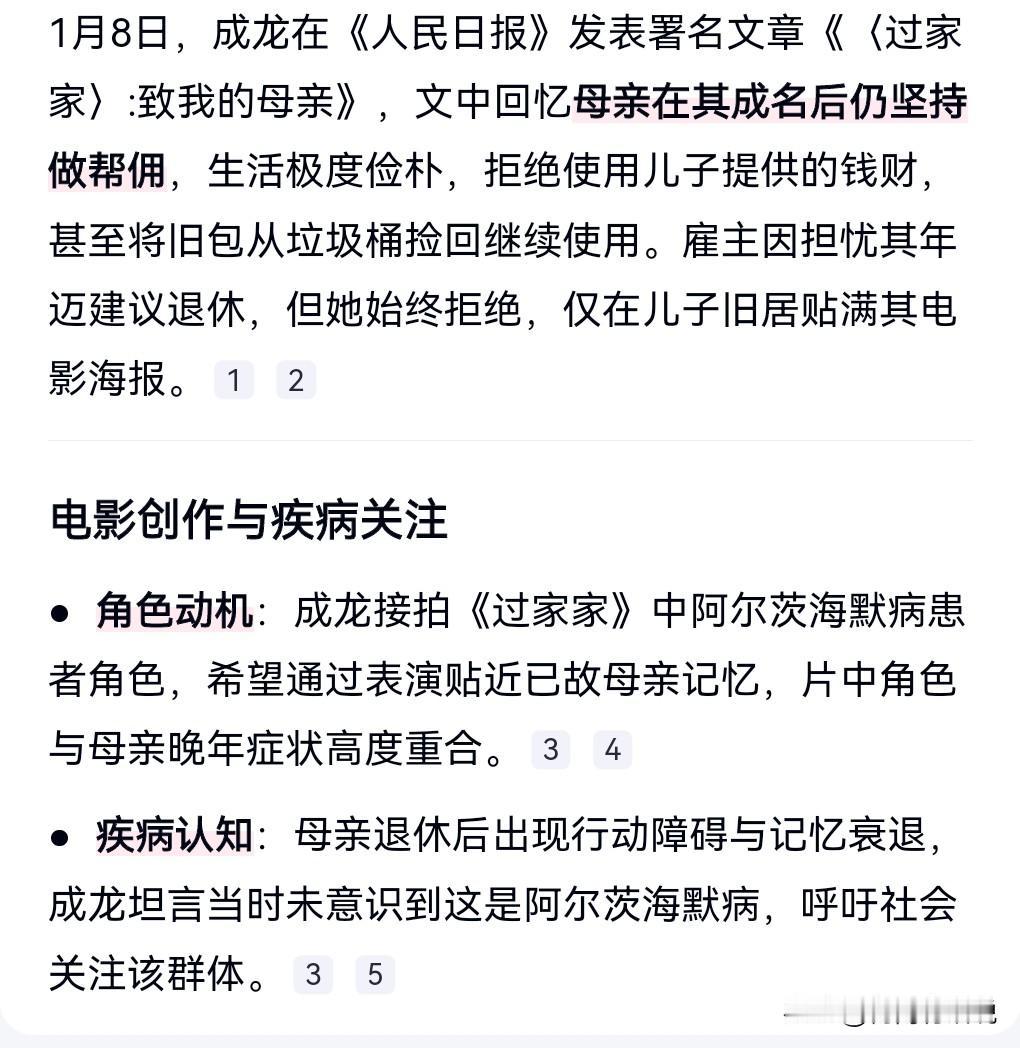 成龙的母亲真的是太让人佩服了。儿子那么大的一个大明星,她竟然不愿意花儿子的钱,要靠自己自食其力。 在《人民日报》撰文的明星是越来越多了。 1月8日消息,成龙称成名后妈妈仍在做帮佣。 这真的是一个勤劳的母亲。 原来成龙的母亲晚年也是一个阿尔兹海默症的患者。 这与他演的《过家家》的角色很像。 对于阿尔兹海默症,这真的是一个值得关注的群体。