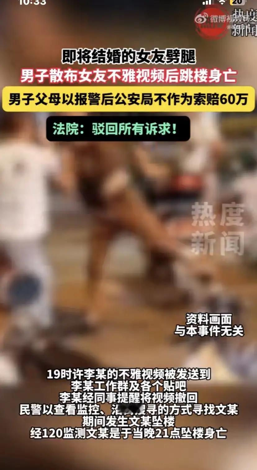 自古奸情出人命,不信请看这件事! 四川充西县的文某,谈了一个女朋友李某,是一名小学老师。俩人谈了八年的恋爱,正要定下婚期的时候,变故发生了! 本来文某和李某俩人早就同居了,文某这天回到宿舍的时候,撞见女友和一男子正在亲密。愤怒的文某和那个男子开始拉扯,可女友却无动于衷,一点都不向着他!这让他心灰意冷,带走了自己送给女友的首饰和电脑,同时在心里暗自做了个决定! 他给女友李某打电话,斥责了她的背叛行为,告诉女友要将其不雅视频发到网上!然后给弟弟和父母打了电话,告诉他们自己不想活了,以后让弟弟照顾好父母! 弟弟和女友李某都报了警,弟弟请求警察帮忙阻拦文某做傻事,但在民警查监控沿街搜寻的时候,文某果断地跳了楼!女友李某的不雅视频出现在了工作群和贴吧,经同事提醒后,李某及时删除了视频! 但文某的父母并没有追究女友的责任,却起诉了公安局,说他们的不作为导致了儿子的坠亡!起诉到法院,索赔60万,被驳回了! 别说法院驳回了,就咱一个普通人,看着应该找的对象也是那个女友啊!如果不爱,早点放手,何必勾三搭四,把文某逼上绝路呢?还身为人民教师,道德底线在哪里呢?