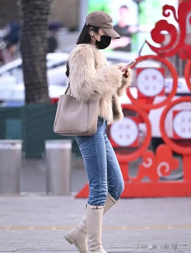 毛绒外套+牛仔裤+高筒靴的都市街头风,谁穿谁时髦!我之前总在穿搭上踩雷,比如靴筒太紧勒出肉,毛领太大抢了脸的风头,颜色搭配太多显杂乱。后来才总结出经验,选靴筒要量好小腿最粗处围度,留两指空间,直筒或骑士靴就不错;毛领宽度别超肩宽三分之一,选短毛、轻毛且颜色贴近外套;全身配色别超三种,同色系更显高级。 外套到臀中或大腿中段,靴筒到膝上1 - 3厘米最佳。牛仔裤裤口略收或改九分,半塞进靴筒随性又酷飒。内搭选发热内衣加薄羊毛针织,保暖又不臃肿。照着这么穿,出街就是时尚模板。