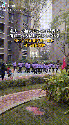 “两者兼得”!重庆,一小区物业要求保安保洁,以及所有工作人员都要练军体拳,小区工作人员表示,这是企业的一个企业文化,每个员工都必须要会,也是为了强身健体,不存在什么考核。 从这个企业文化可以看出物业公司有着自己完善的体系,其管理应该也是比较严格的,练习军体拳确实可以起到强身健体的效果,毕竟人活着身体健康比什么都重要。 现在很多人为了工作就会缺乏锻炼,这个物业工作人员不仅可以上班,同时也可以锻炼身体,可以说是两者兼得了。 可能有的员工开始会不适应,但是慢慢的就会习惯,只要养成了习惯,那么坚持下去就轻而易举了。