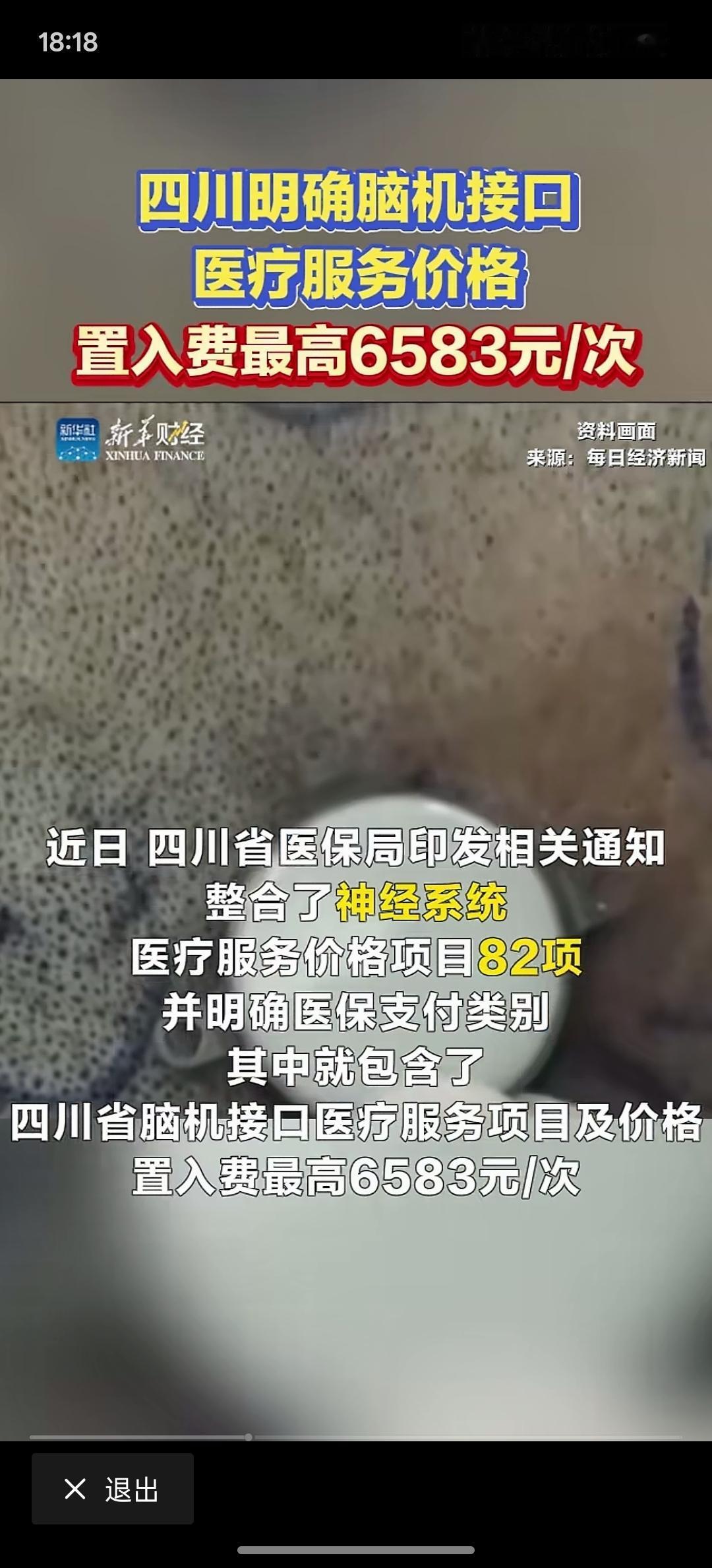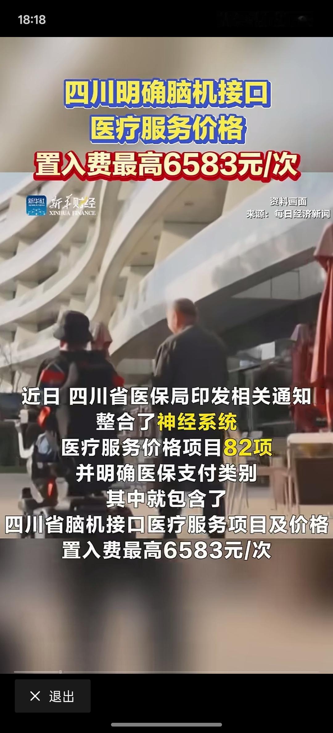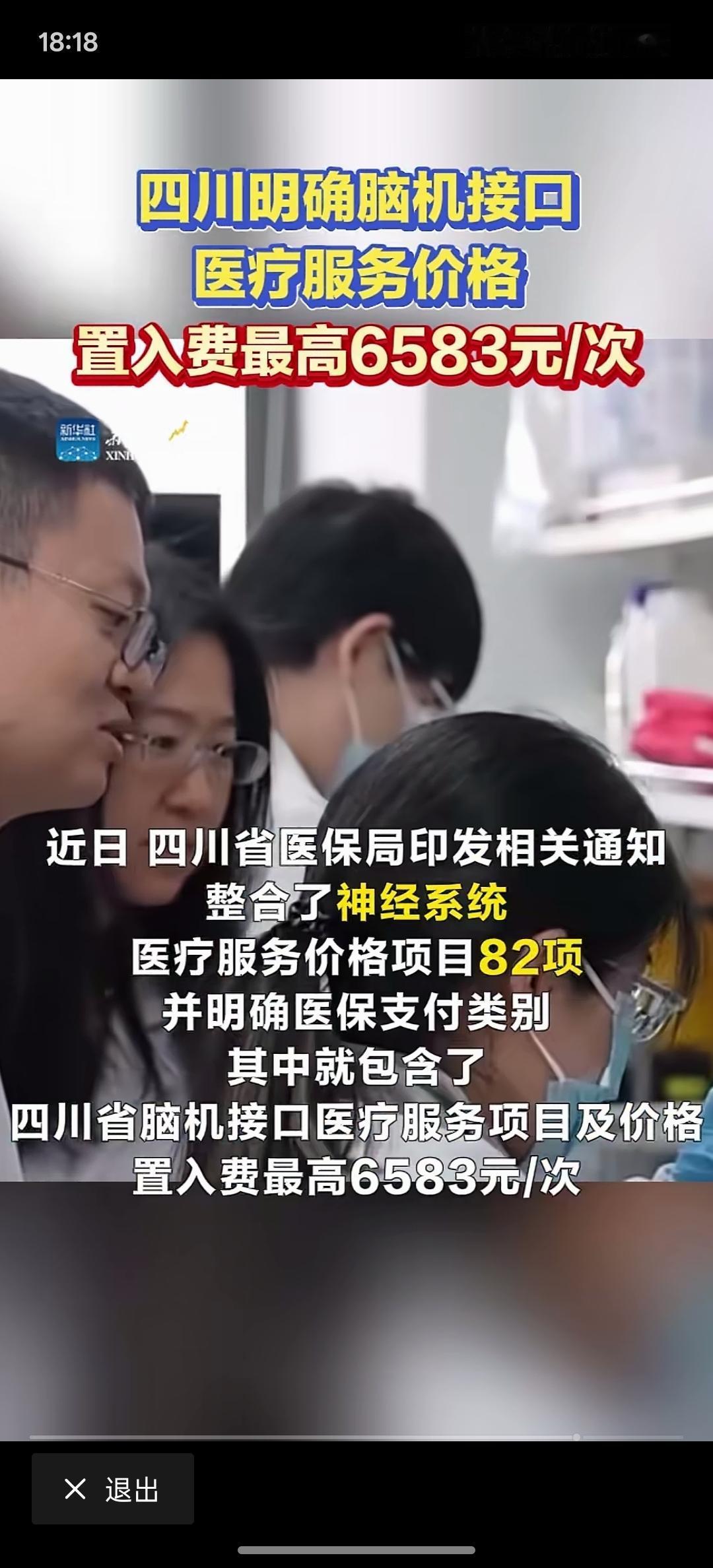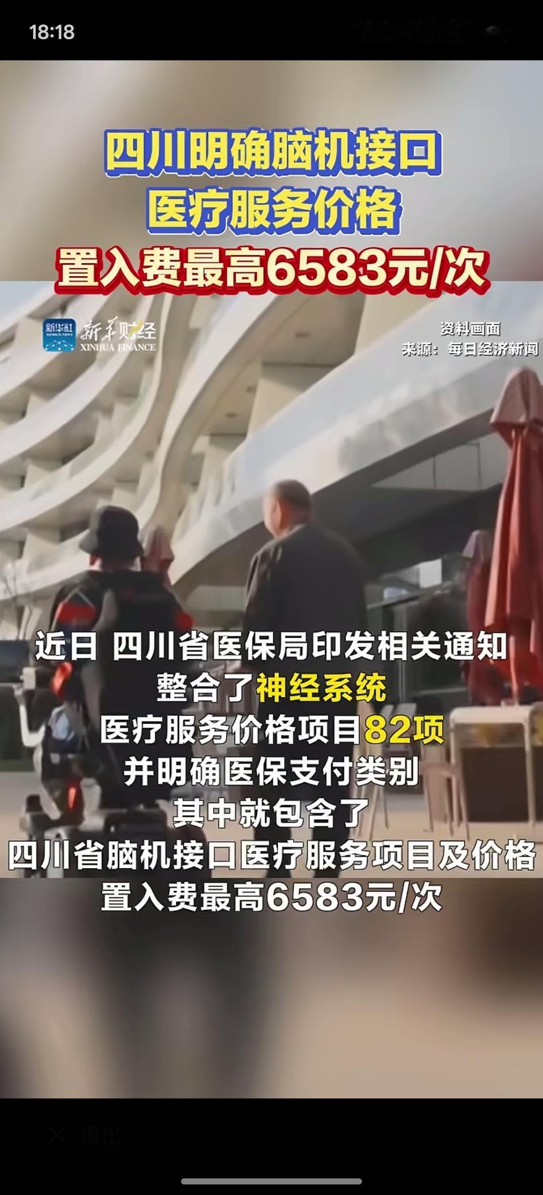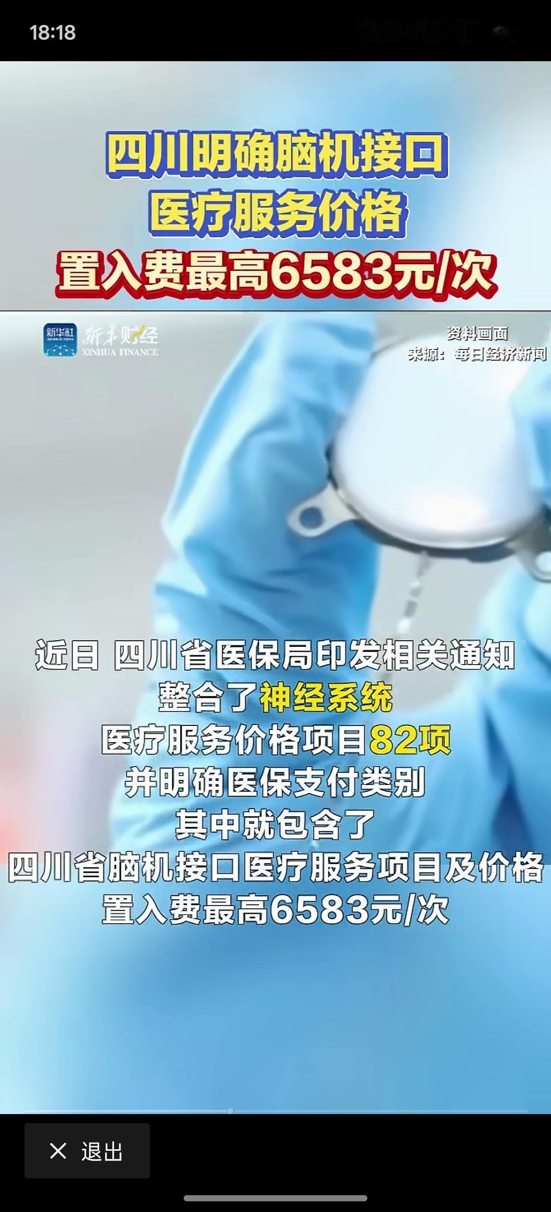 谁都没想到吧,中国的脑机接口技术这么快,四川明确脑机接口医疗服务价格 置入费最高6583元/次,已经开始可以实现脑机接口医疗服务了!可以帮助人类解决一些疾病问题!包括记忆衰退,骨髓神经!身体瘫痪的这些未来都可以实现脑机接口技术恢复!这借口确实为医疗以及医学带来了很大的实用!人工智能将通过脑机接口技术实现人类用意念来控制很多关键设备,甚至未来在远程科研手术都可以实现这样的技术操控!