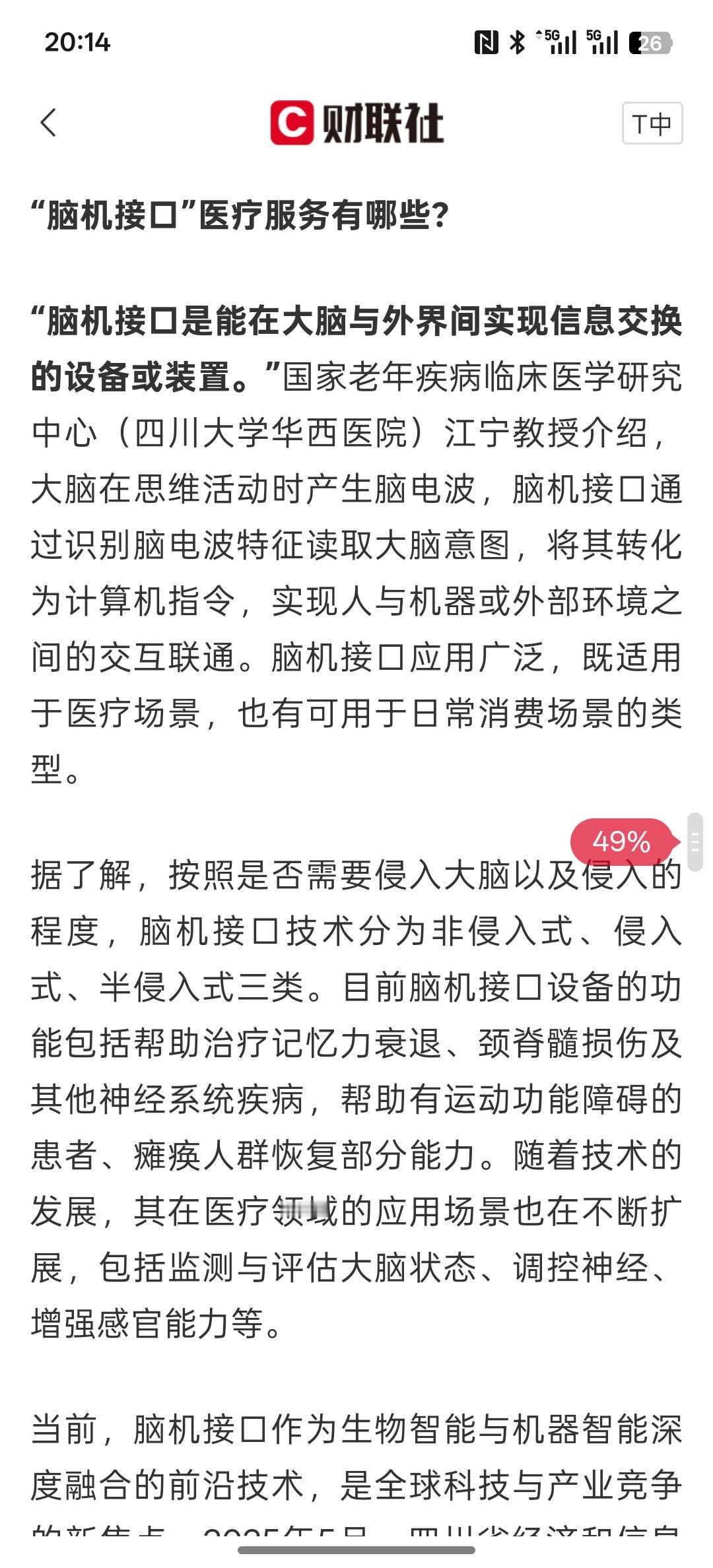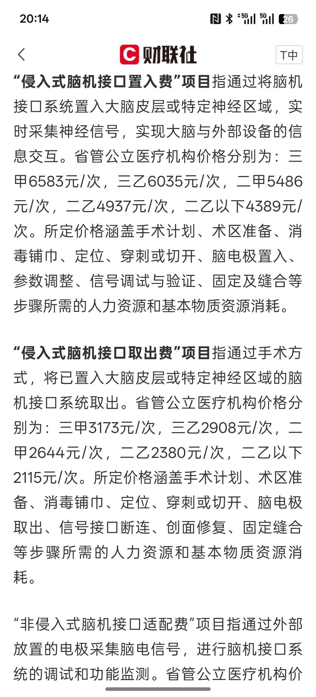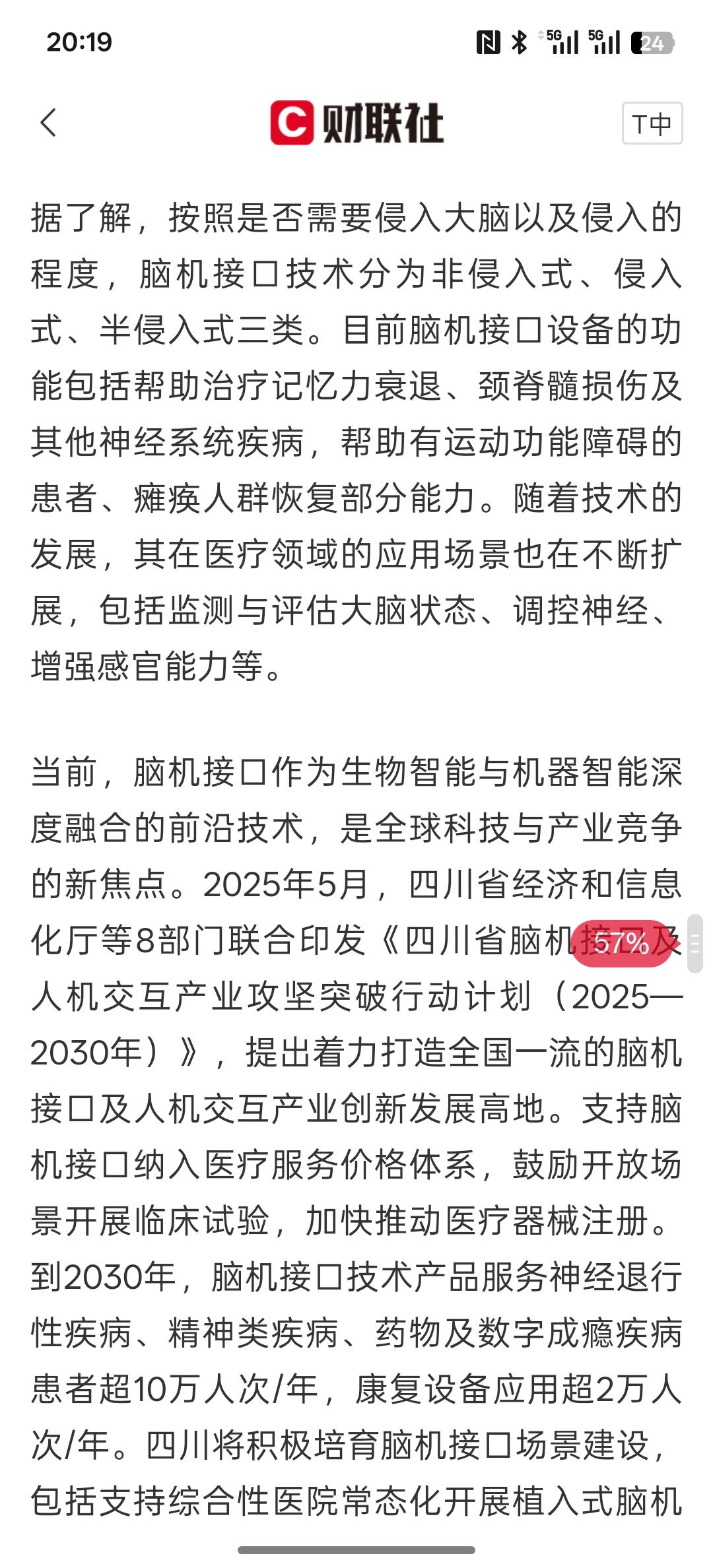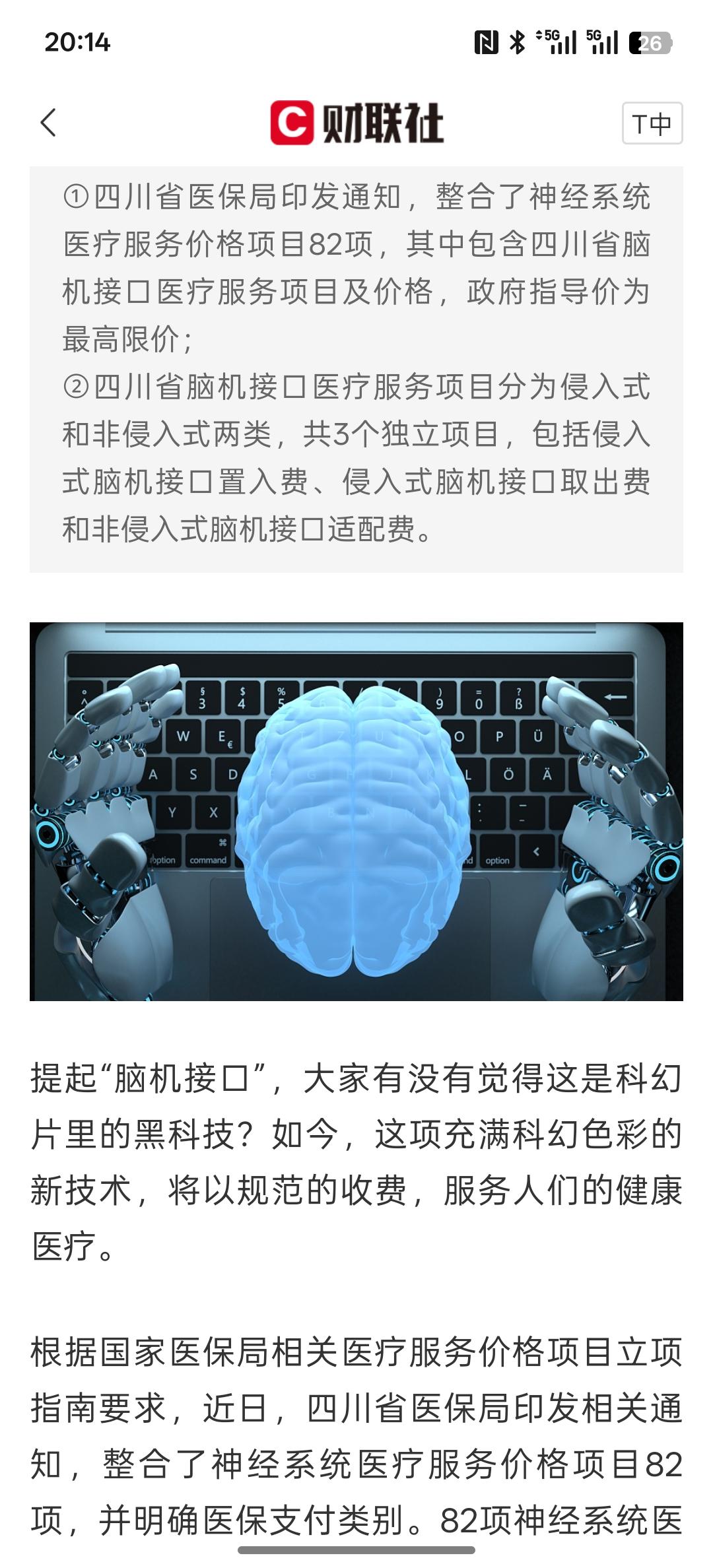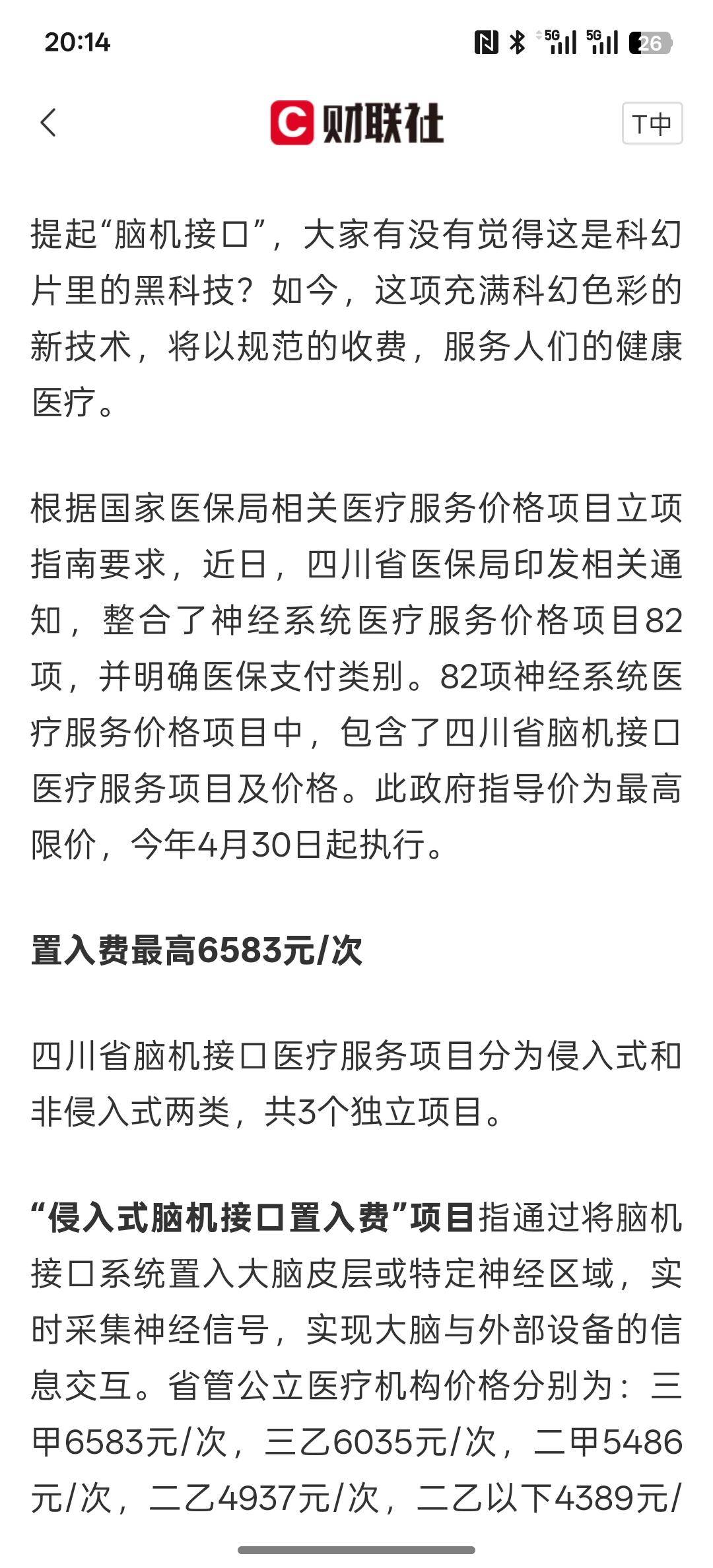 谁都没想到吧,中国的脑机接口技术这么快,四川明确脑机接口医疗服务价格 置入费最高6583元/次,已经开始可以实现脑机接口医疗服务了!可以帮助人类解决一些疾病问题!包括记忆衰退,骨髓神经!身体瘫痪的这些未来都可以实现脑机接口技术恢复!这借口确实为医疗以及医学带来了很大的实用!人工智能将通过脑机接口技术实现人类用意念来控制很多关键设备,甚至未来在远程科研手术都可以实现这样的技术操控!