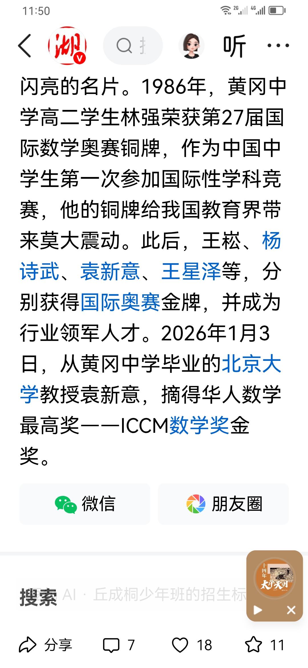 著名数学家丘成桐教授在著名的黄冈中学设立丘成桐少年数学班。该校著名校友袁新意刚刚获得全球华人数学家大奖。 该奖实际上也主要由丘成桐发起设立。 丘大师对于中国数学发展倾注后半生心血,在北大设丘班,又到基层中学设少年班。 他相信,近十几年中国数学人才与数学成果都将呈井喷式发展。 数学是最基础的科学之一,前人裁树,必将结出硕果。